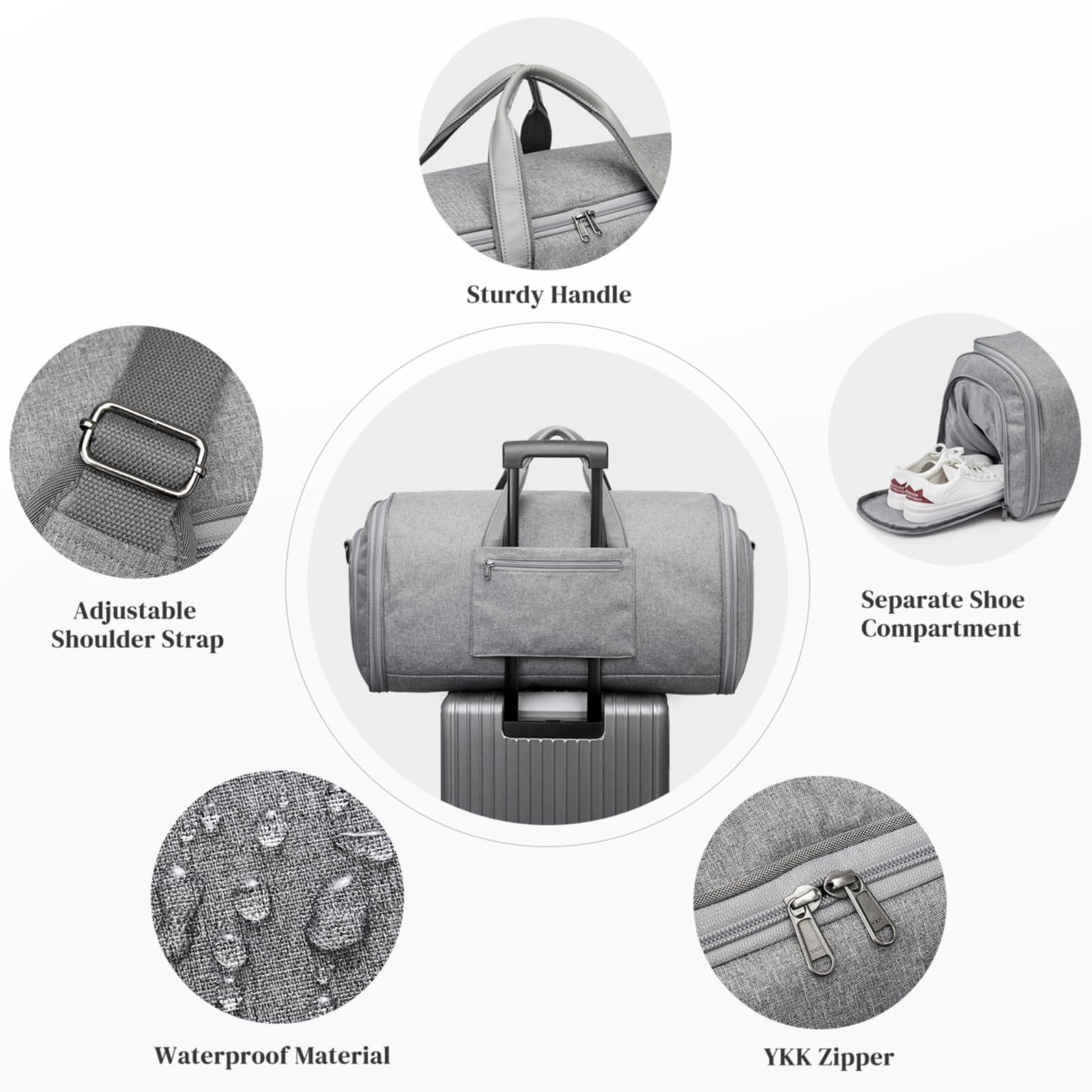 【ユーザーフレンドリーなデザイン】: 3つの方法で持ち運びが簡単: 短いループハンドルにより、衣類旅行バッグを空港で簡単に持ち運ぶことができます。取り外し可能で調節可能なショルダーストラップで直接持ち運ぶことができ、バックスリーブにより、この旅行用ダッフルバッグをスーツケースや荷物の延長ハンドルに滑り込ませることができます