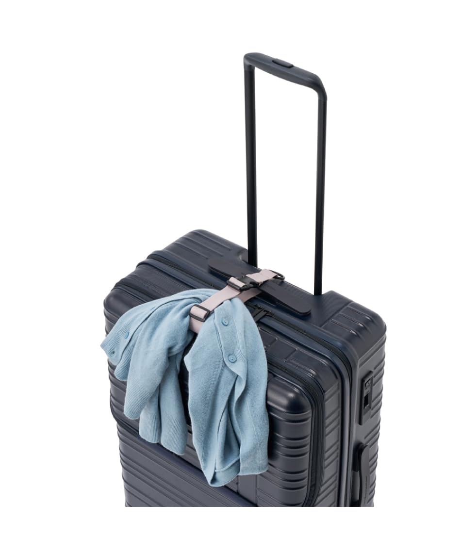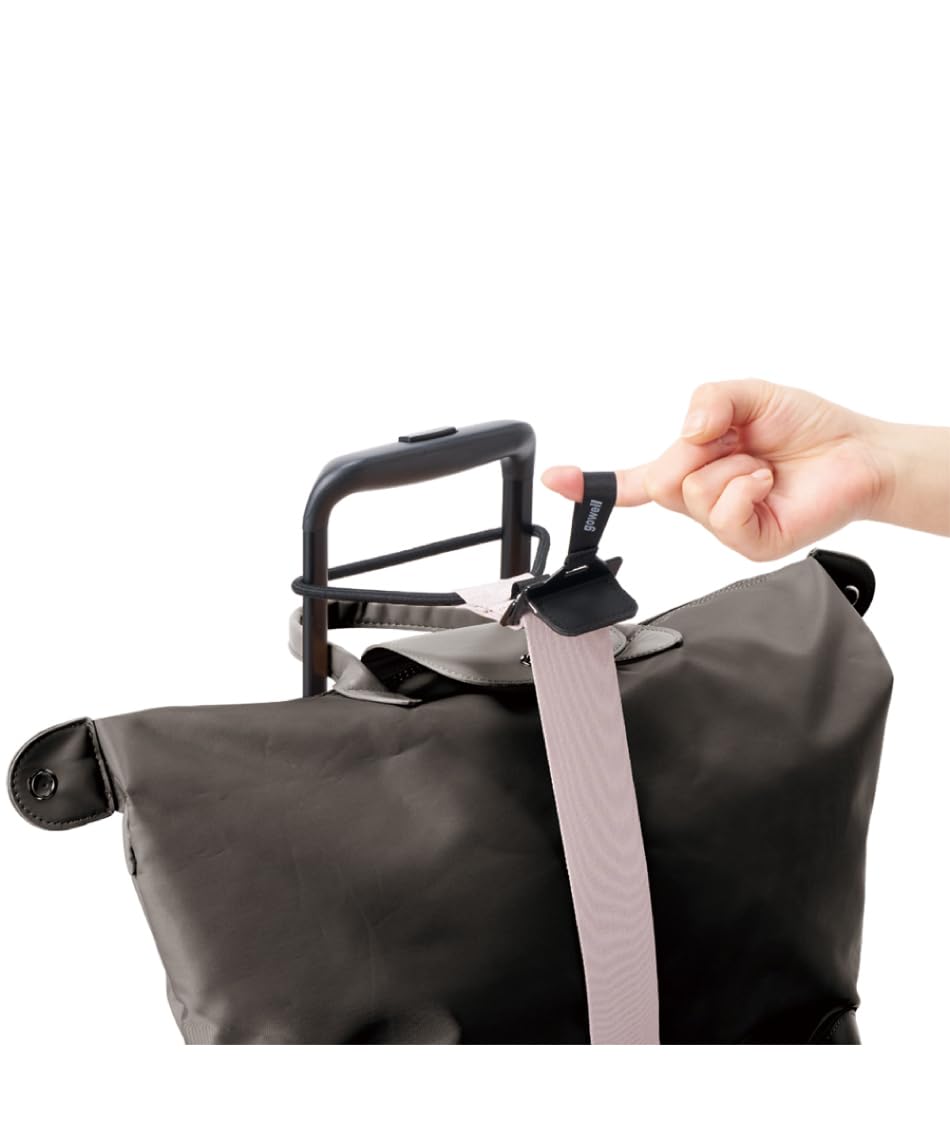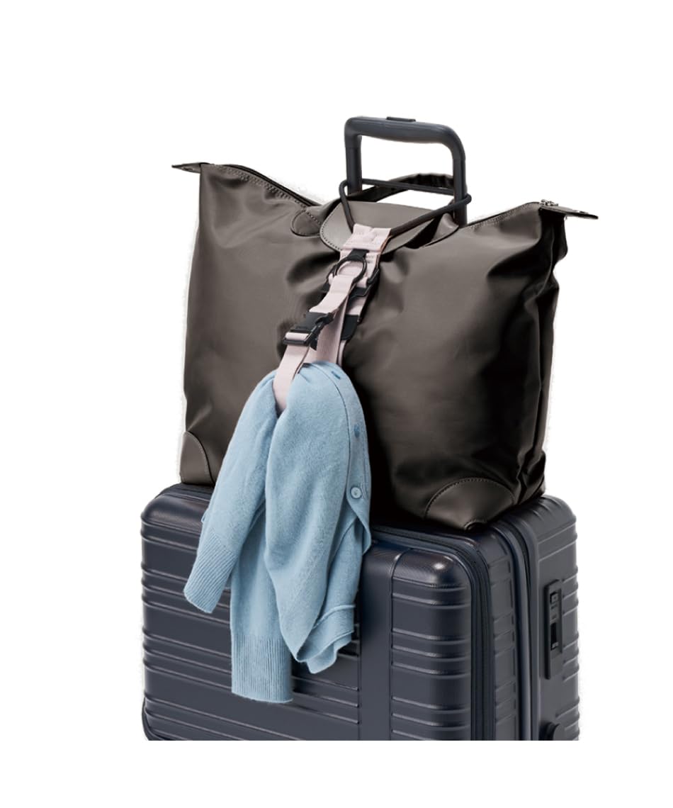 大人気のバッグとめるベルトと洋服とめるベルトがセットになった便利なアイテム! ゴムの長さが従来品より長くなり、大きめの荷物にも対応。デザインもスタイリッシュにアップデートしました。 旅行や出張の際に荷物が増えてしまった場合や、サブバッグの持ち運びが便利になる一品です。 幅広ベルトと強力ゴムでスーツケースの上にガッチリ固定できます。 ベルトをスーツケースのハンドルに通してバッグを留めれば簡単に固定できます。