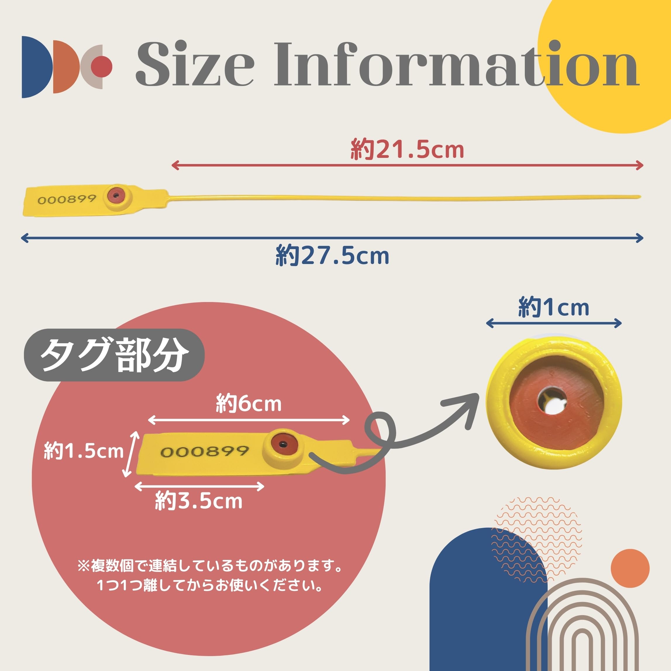 【商品仕様】全長:約275mm,幅:約15mm,ループ部分:約215mm,素材:PP、PE、スチール製ロックシリンダー,セット数:赤×50本、黄×50本(計100本)