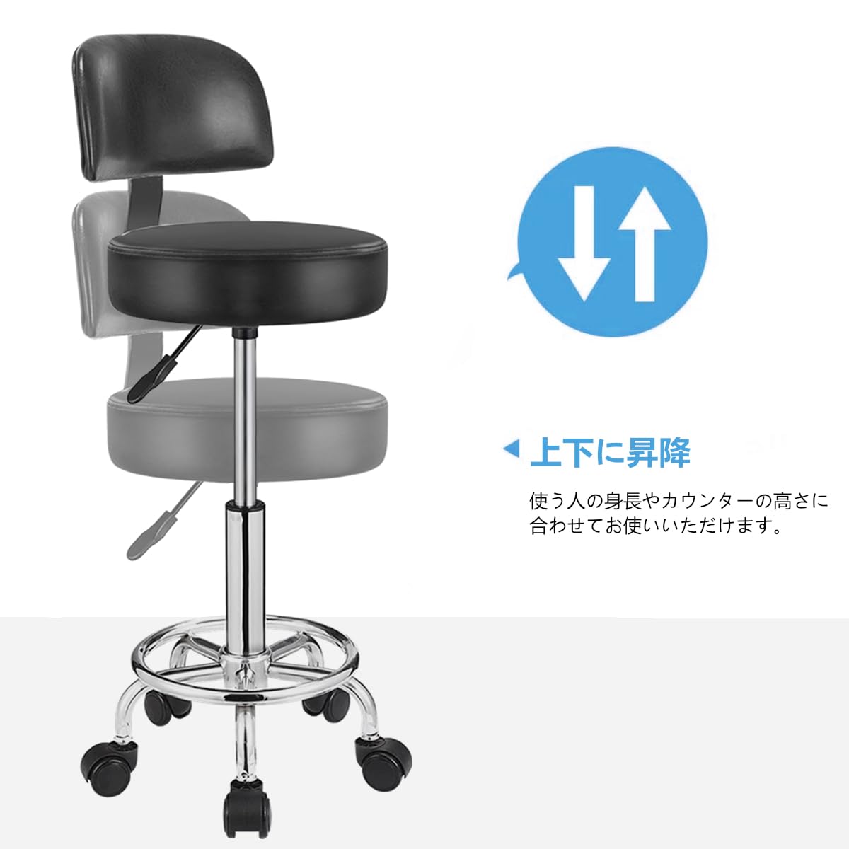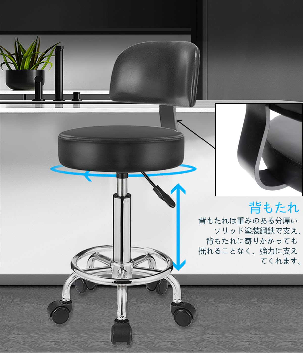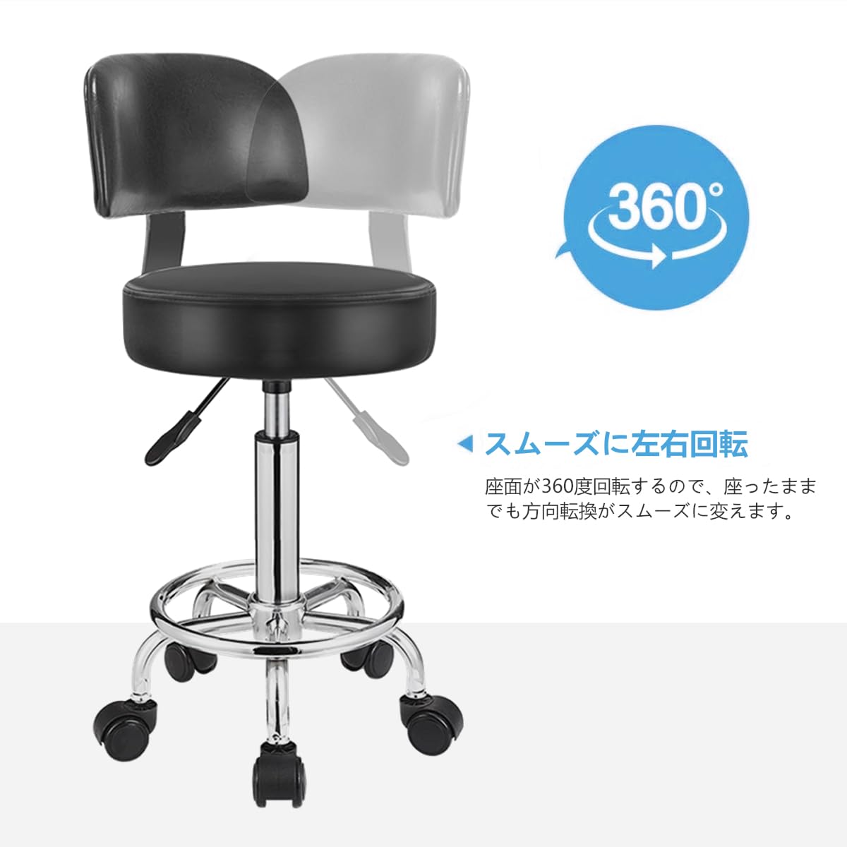 【数量限】丸椅子 丸スツール キャスター付き 昇降椅子 エステスツール 背もたれ付きチェア 360°回転 クッション 美容院/スパ/キッチン/サロン ブラック 高さ調整45-61cm | GIGATERA