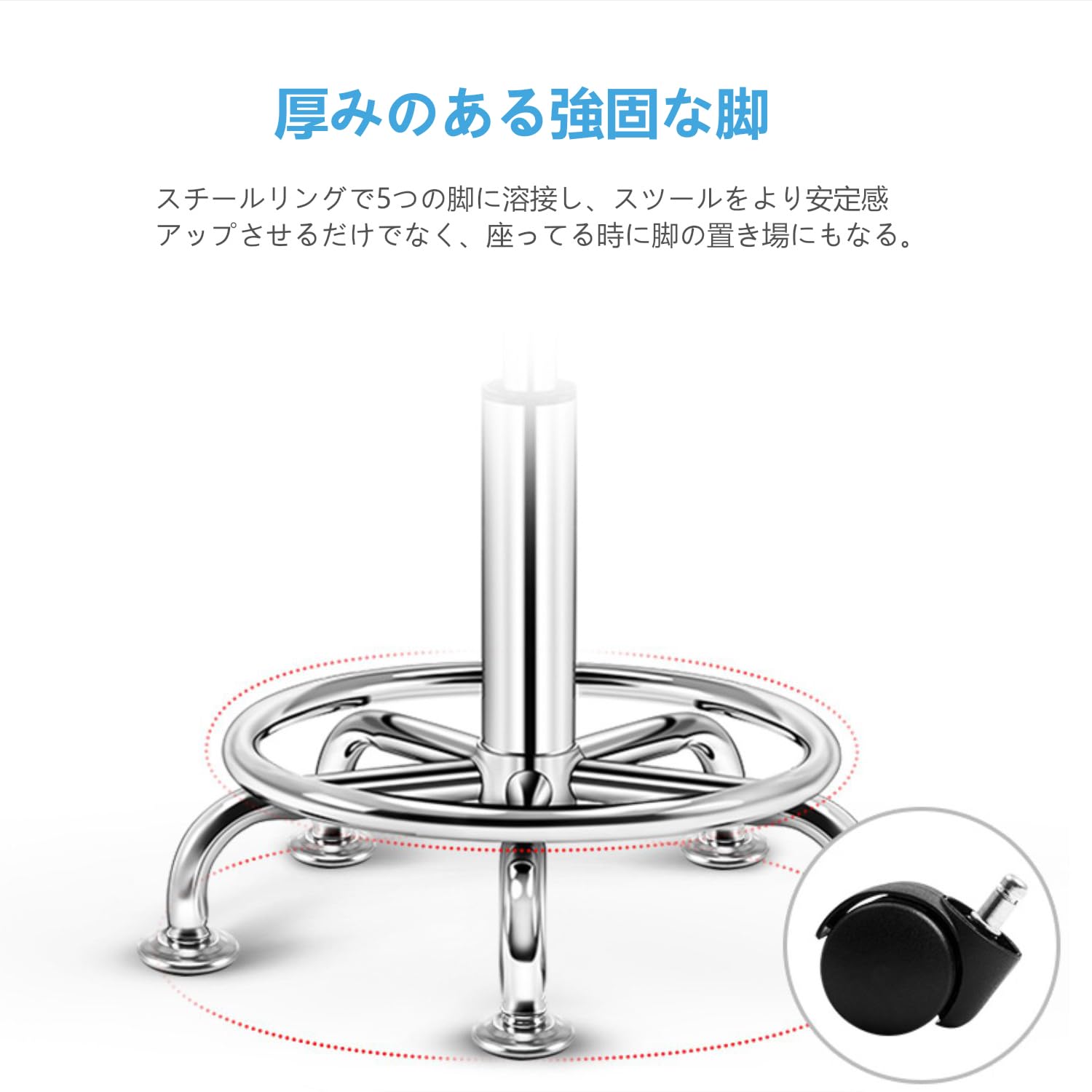 ?【便利なキャスター付き】5つの脚に強固なスチールリングを溶接し、座ったままで安定して移動ができます。移動も軽々だから、必要な時に必要なところへ気軽に移動できます。スチールリングは脚の置き場にもなります。脚は頑丈なスチール製で、見た目も美しく錆びにくいクロームメッキ加工が施されています。