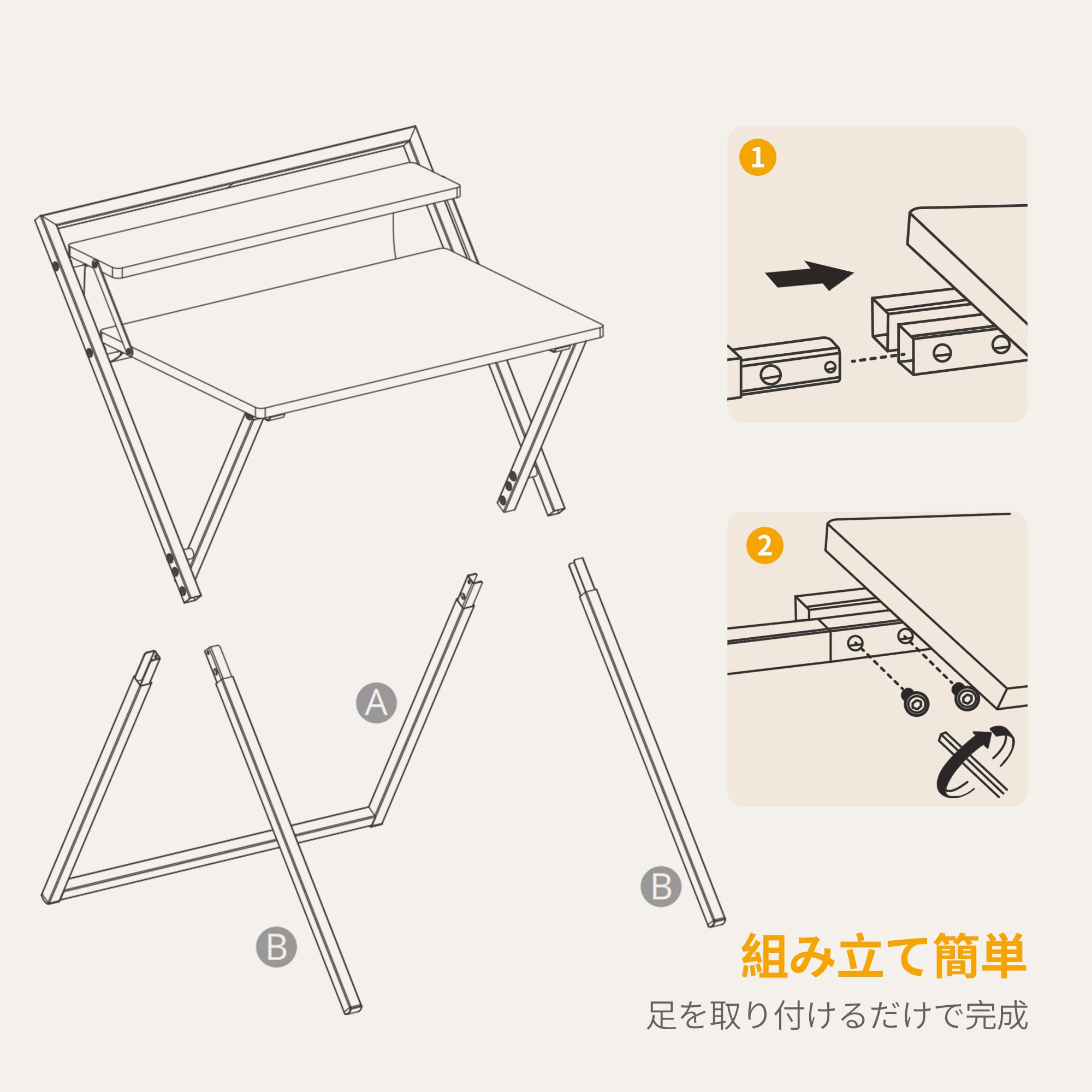 組み立ては簡単:足を取り付けて開くだけです。使用しないときは簡単に折りたたんでスリムに収納できます。