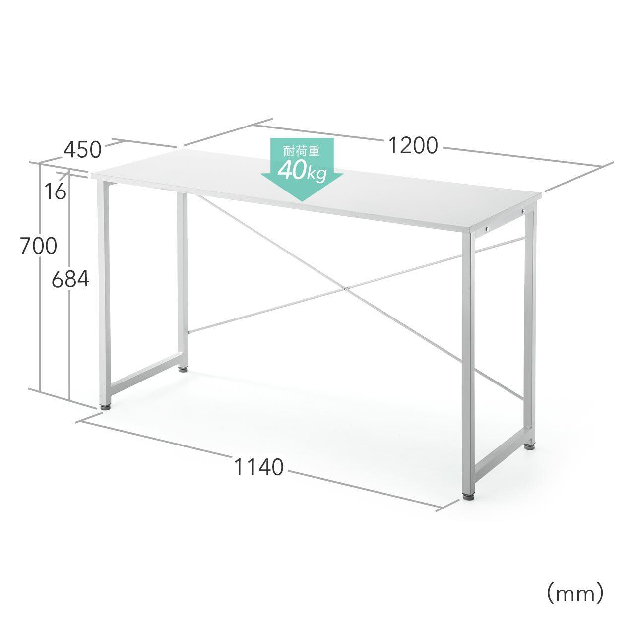 横幅120cm、奥行45cm、高さ70cmのシンプルワークデスクです。汚れに強く、高強度のメラミン化粧板を使用しています。