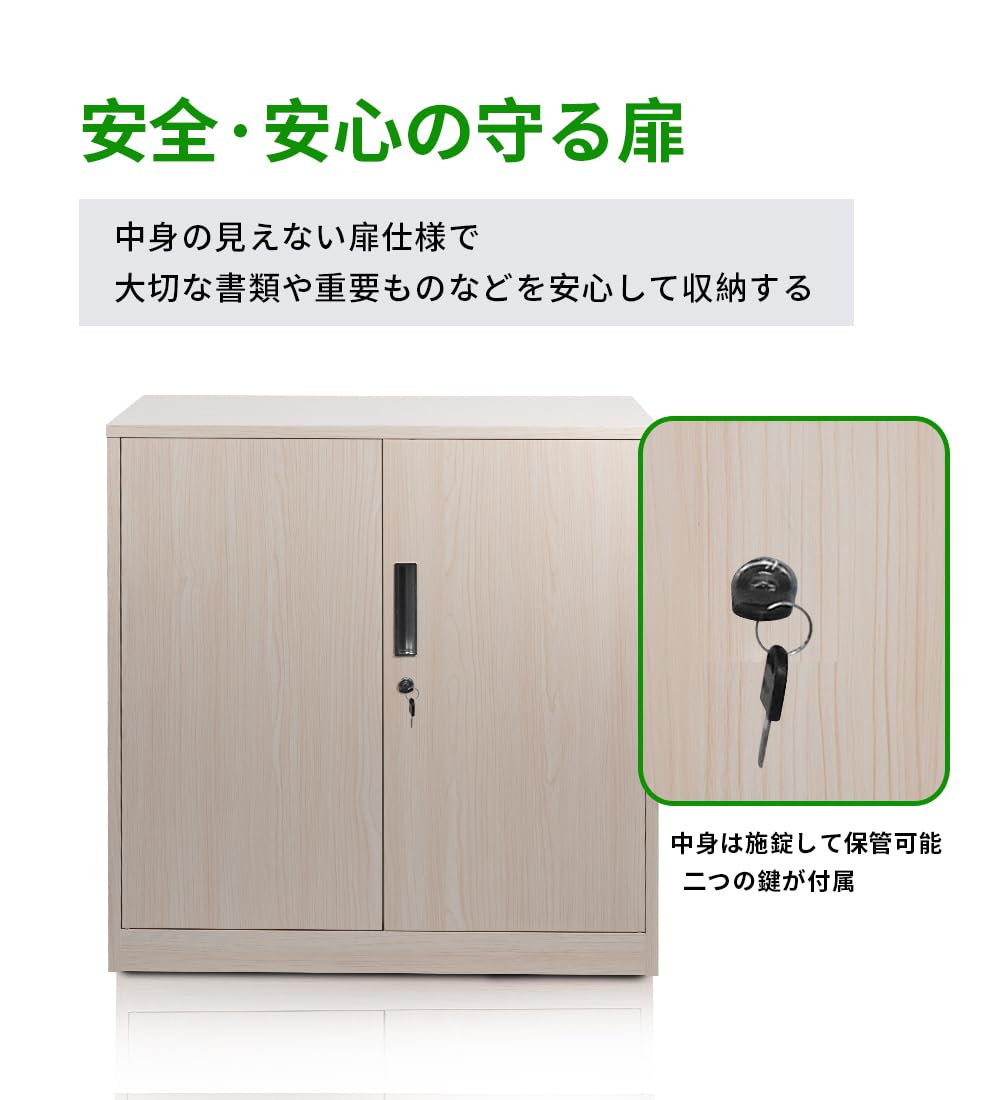 【汎用性と安心感】錠付き両開きドアで、実用性を高めるだけでなく、使用者に安心感と信頼性をもたらします。オフィスや自宅での機密情報の保管に理想的な選択肢です。