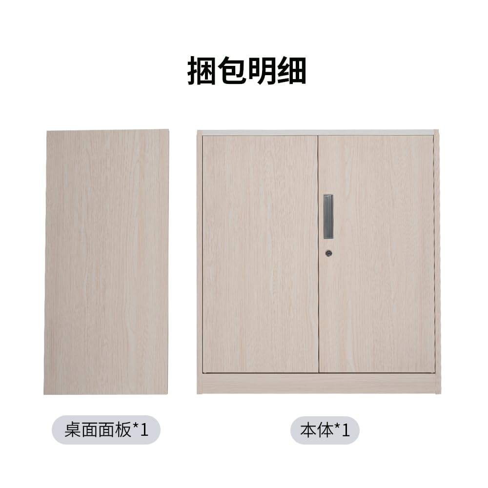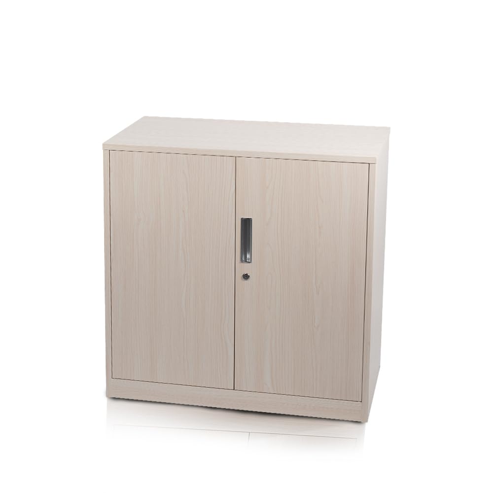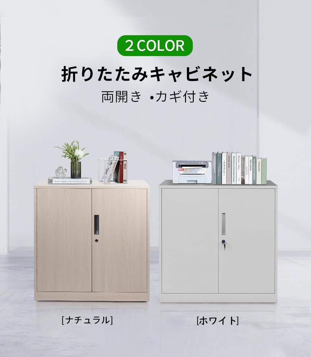 折りたたみ式キャビネット 両開扉タイプ 40D x 85W x 90H cmカギ付き スチール製 ベース付き 収納 書棚 オフィス (ナチュラル(木目柄))