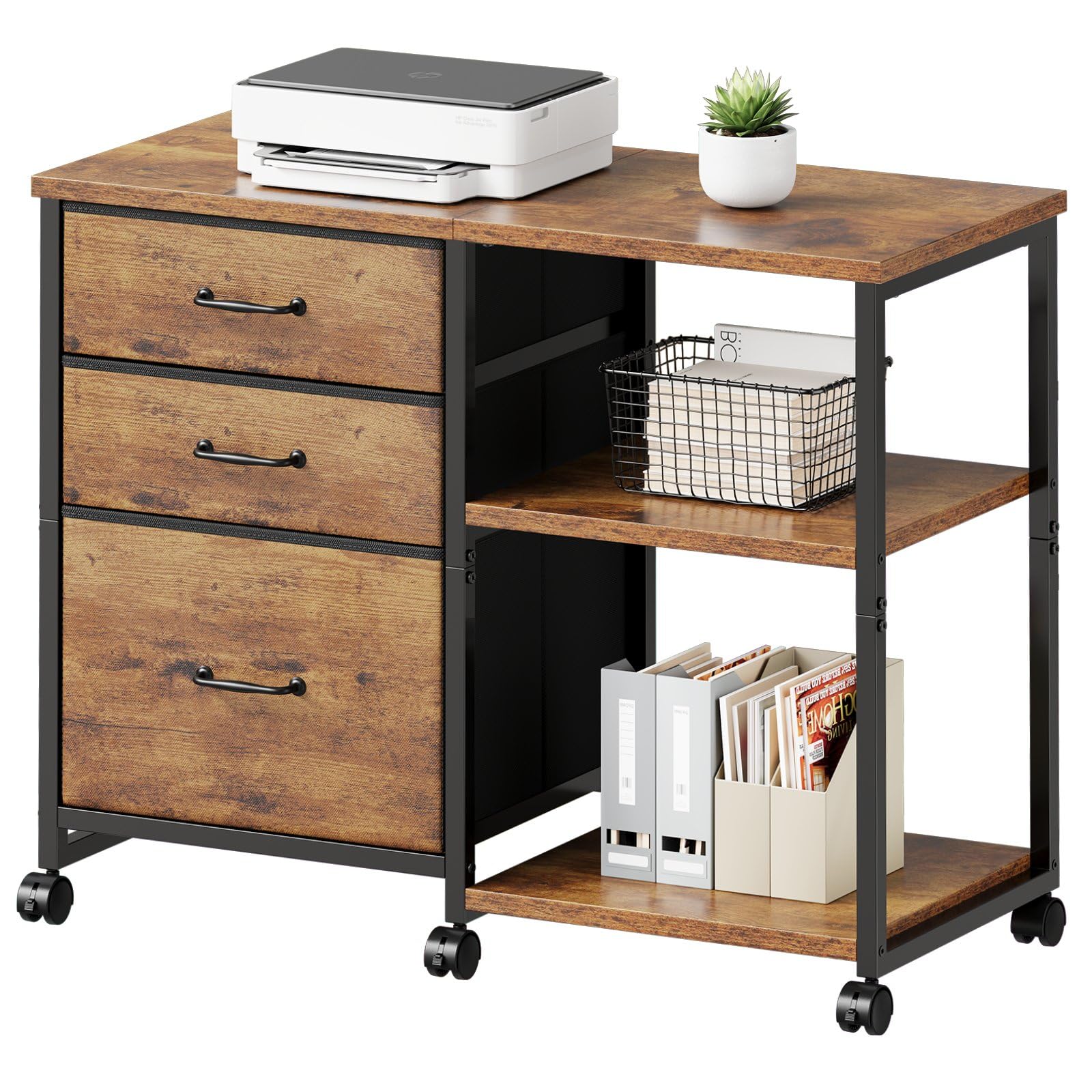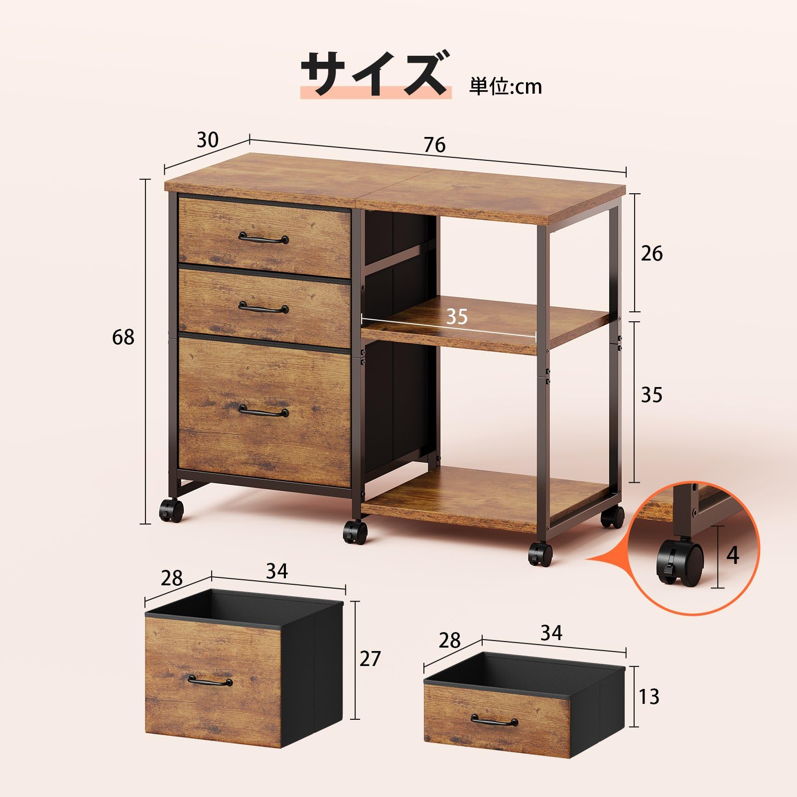 【特価在庫】サイドキャビネット デスクワゴン 布製 袖机 層板付き サイドワゴン 3段 オフィスワゴン A4対応 プリンター台 大容量 キャスター付き デスク下収納 ビンテージ+ビンテージ