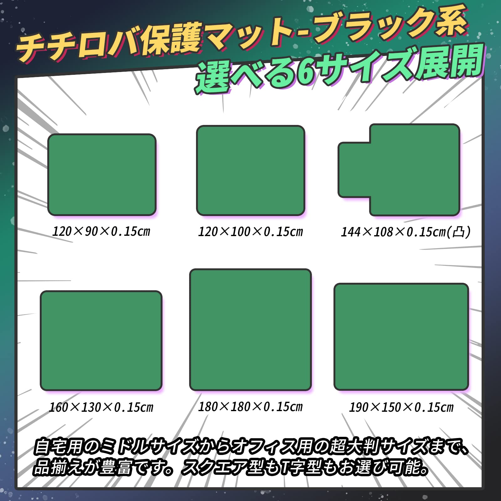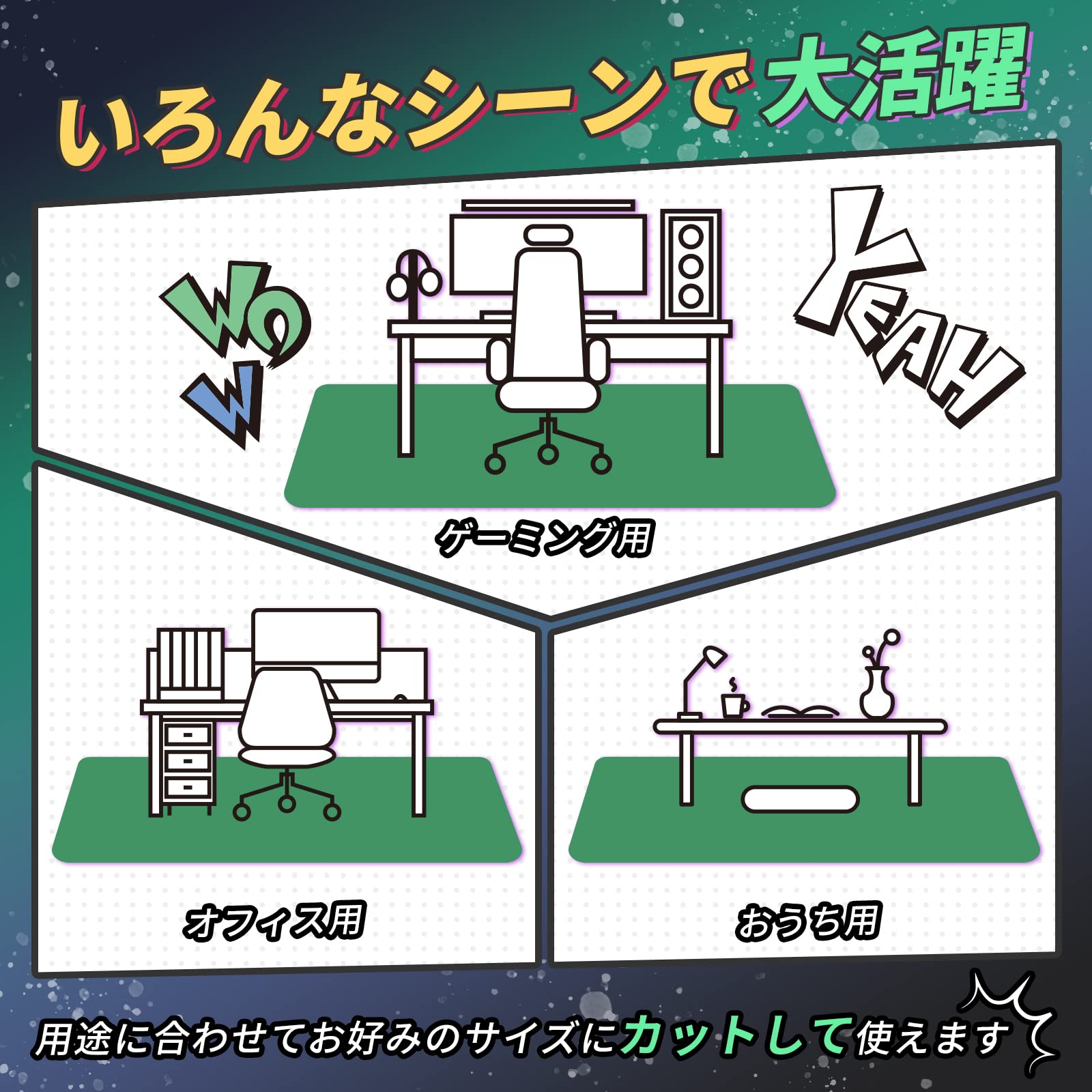 【カットOK・さまざまなシーンで活躍】さまざまなシーンに応じて対応できる豊富なサイズを取り揃えております。さらにカットもOKなので、細かなサイズ調整・プチ調整も可能です。ゲーミングチェアマットや在宅ワーク、オフィス、学習用、キッチンマットとしても使用できます。