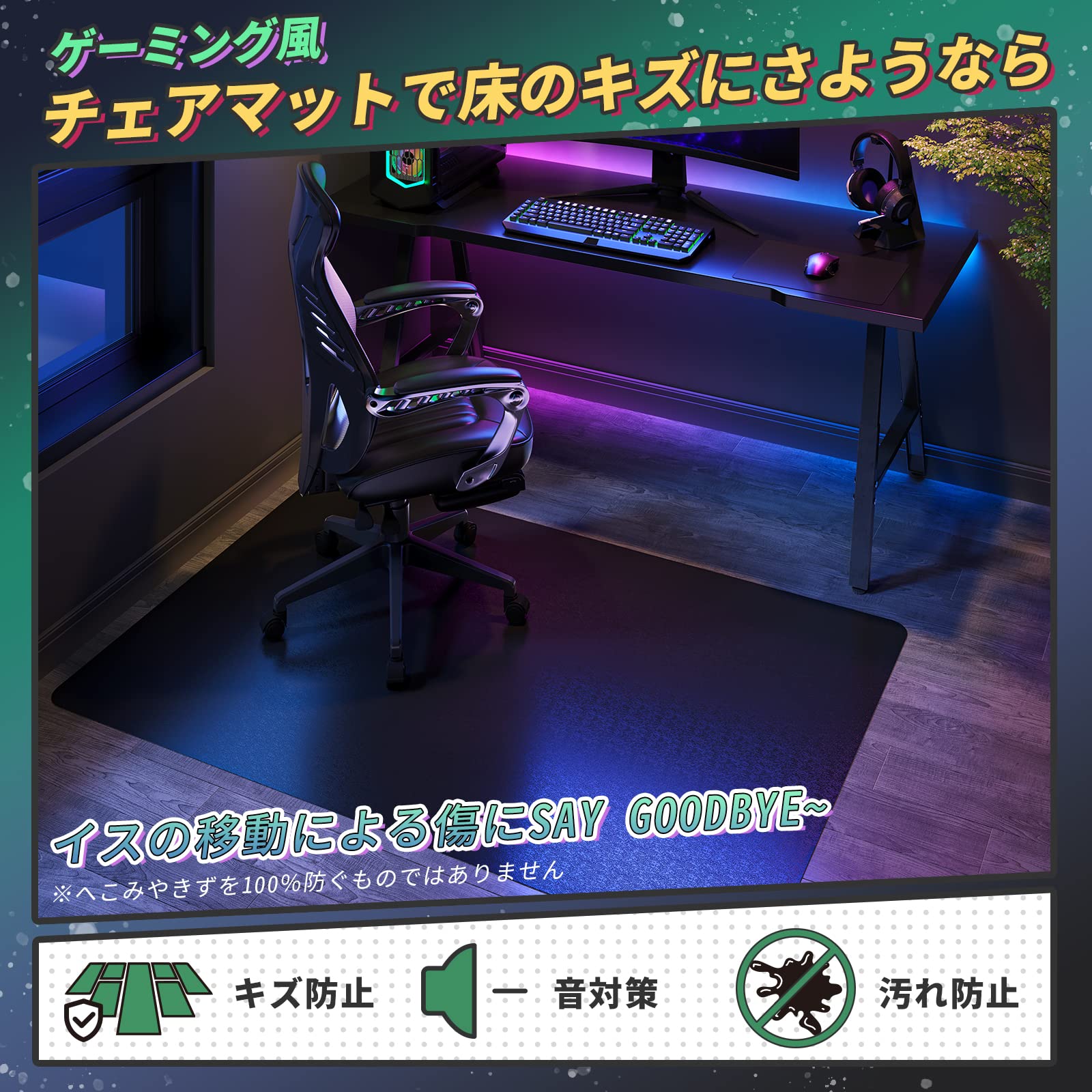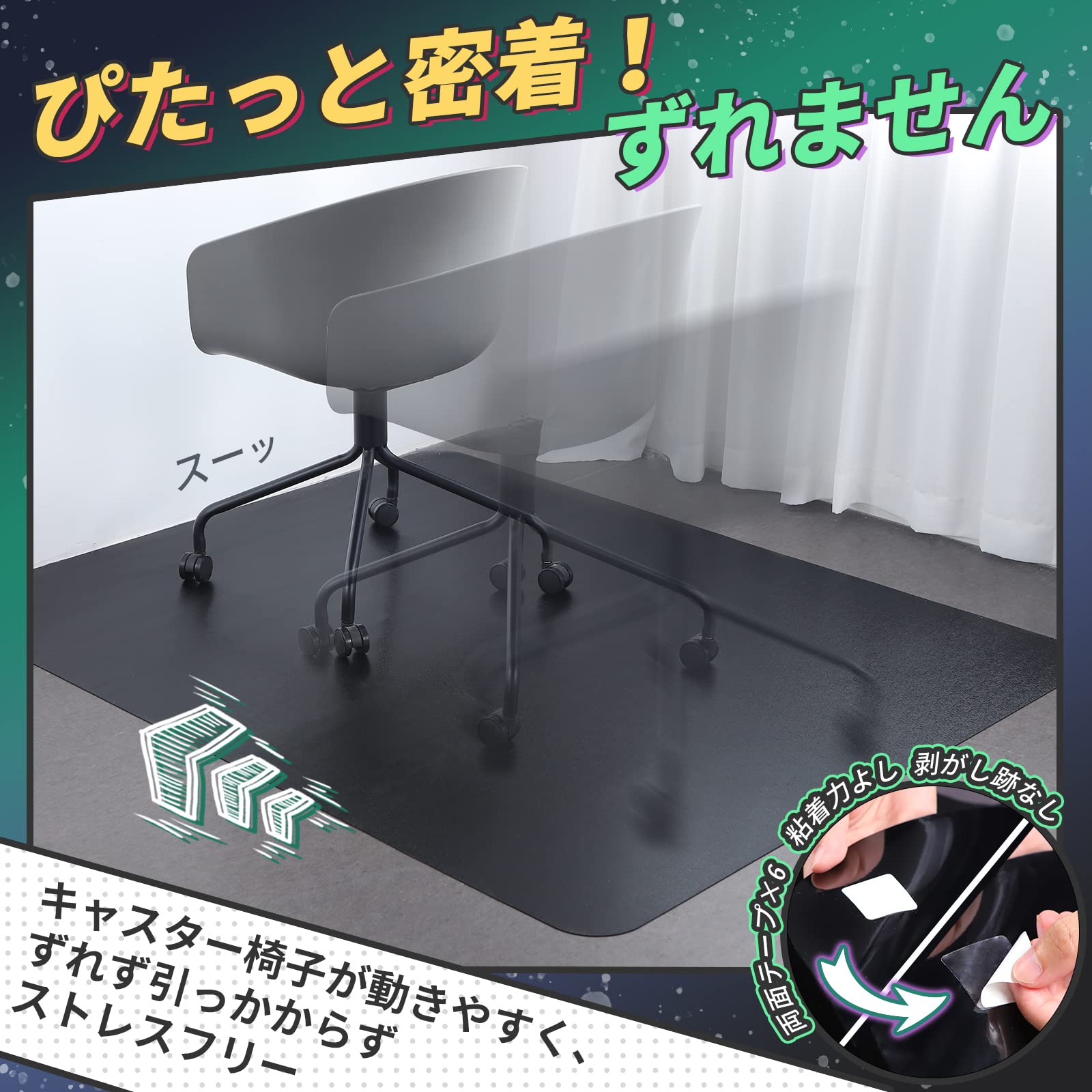【両面テープ付・ずれ知らず】滑り止め用の両面テープ6枚ついており、粘着力もありながら剥がしやすくて床にやさしいです。キャスター椅子を思い切って動かしてもマットはずれません。さらに掃除機をかけても吸い上がらないので、掃除が楽になります。