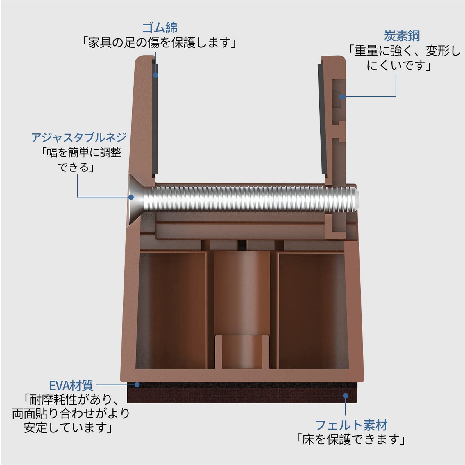 【エコパッド】 このフットマットの底部にはフェルトシールが採用されており、継ぎ脚 が滑らず、床に傷もつきにくく、防音効果も発揮します。家具を運ぶときに床が損なわれる心配は全くありません。