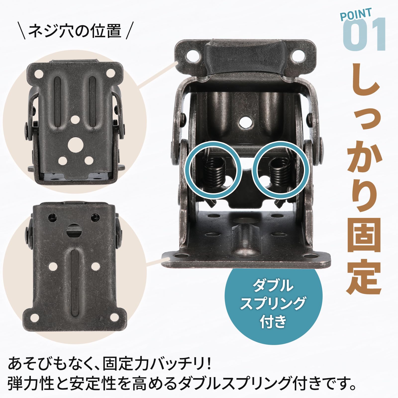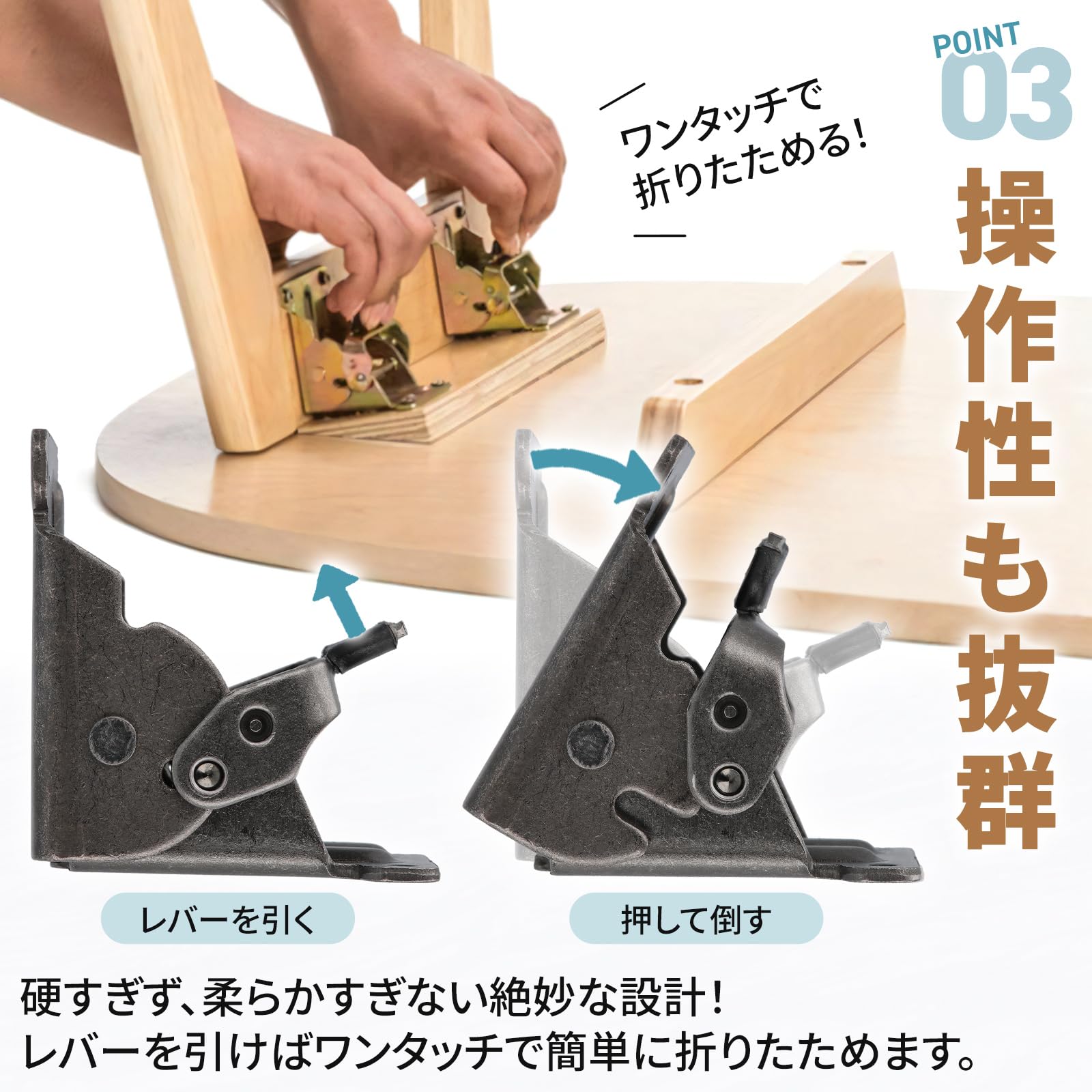 【特徴】付属のネジを固定するとすぐに使用でき、レバーを引いてワンタッチで折りたたみ可能です。脚を畳むことで片付けに役立ち、省スペースにもなります。また、手作り家具などのDIYにもお勧めです。