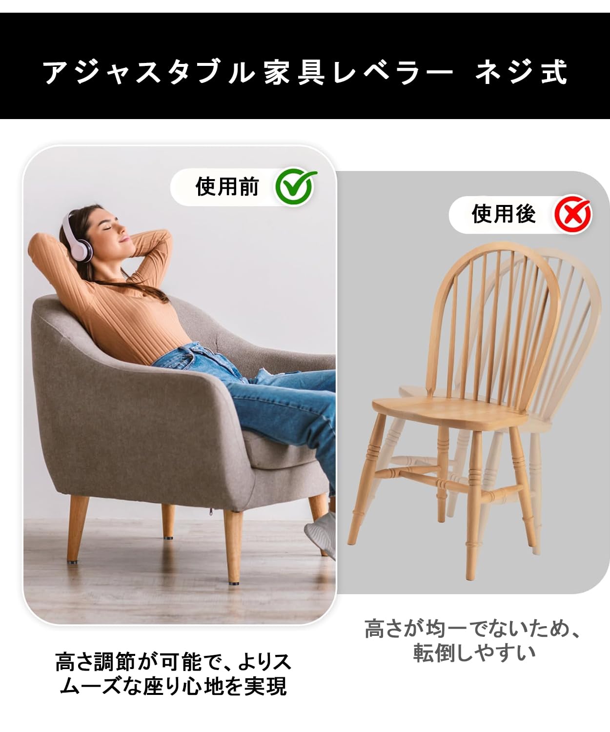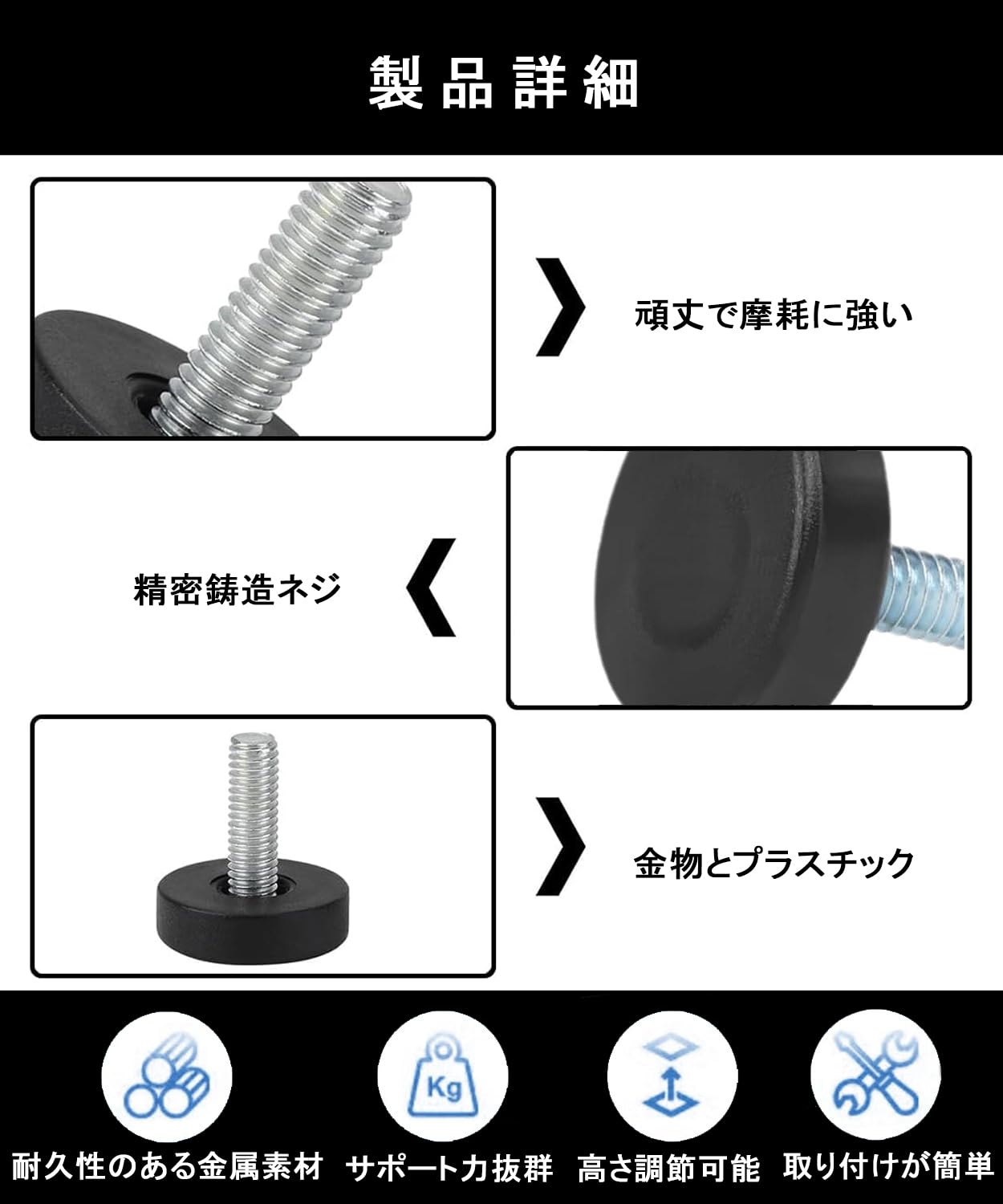 【安定バランス】 滑り止め材質を採用し、様々な床面で家具が安定して設置できるよう設計されており、強力なサポート力を提供します。調節可能なデザインにより、家具を湿気のある床面から遠ざけ、滑りや湿気を防ぎ、家具と床を二重に保護します。