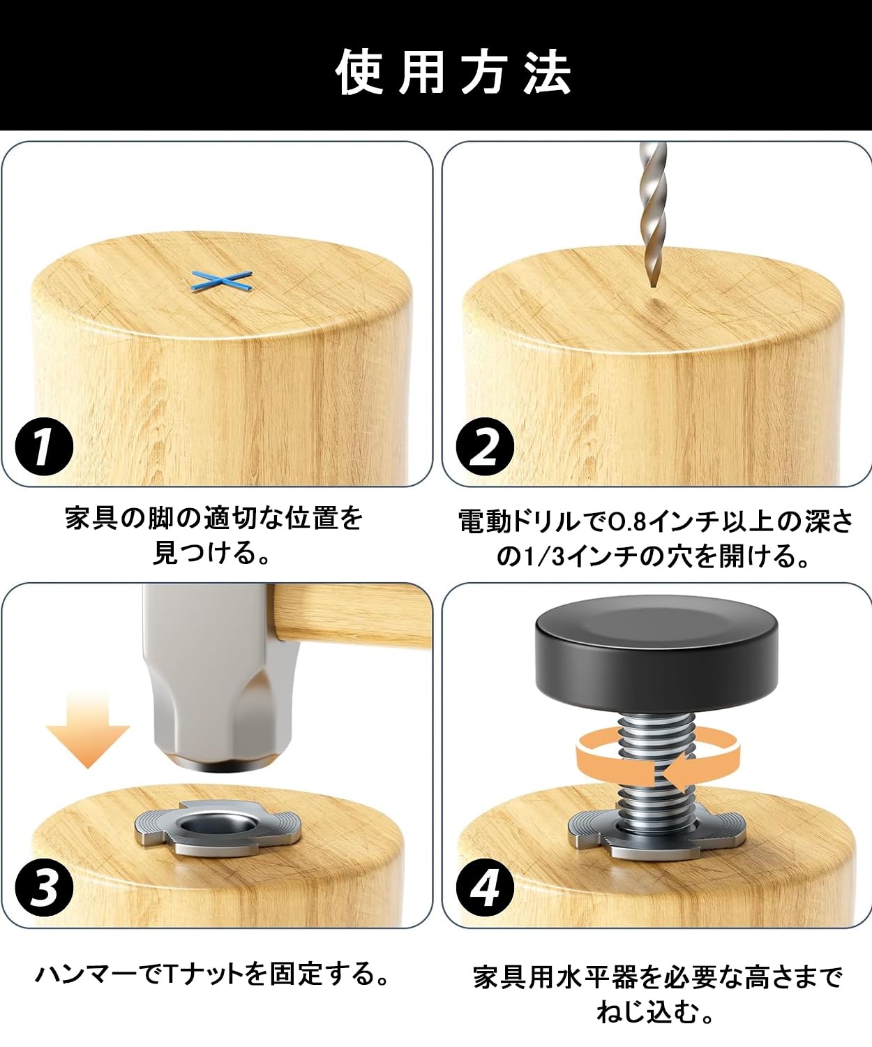【使いやすい】 家具の脚に直径1/3インチ、深さ1インチの穴を開け、ハンマーでTナットを取り付け、その後ベーススクリューを回すだけで簡単に設置できます。レベル調整脚は必要に応じて高さを自由に調整できます。