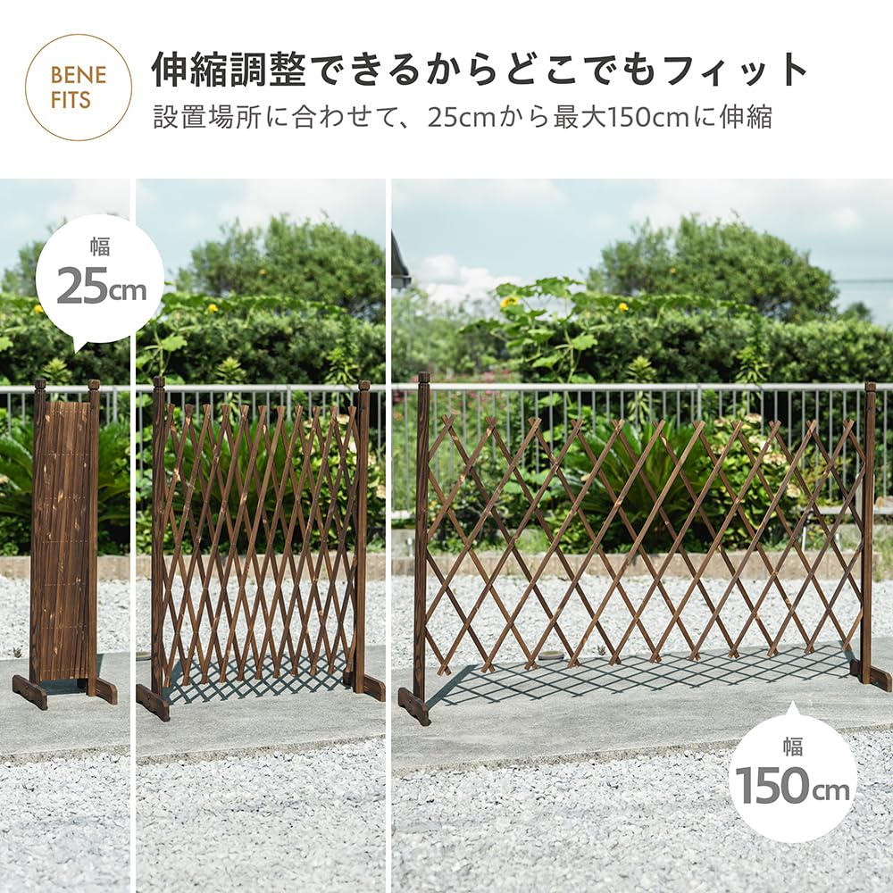 【置くだけで完成!工事不要の自立式】 お庭や玄関の目隠し、リビングの間仕切りに。約1.2kgの軽量設計と自立式の脚で、届いたらすぐに置くだけで設置できます。アコーディオンのように幅150cmまで伸縮し、使わない時はコンパクトに収納可能です。