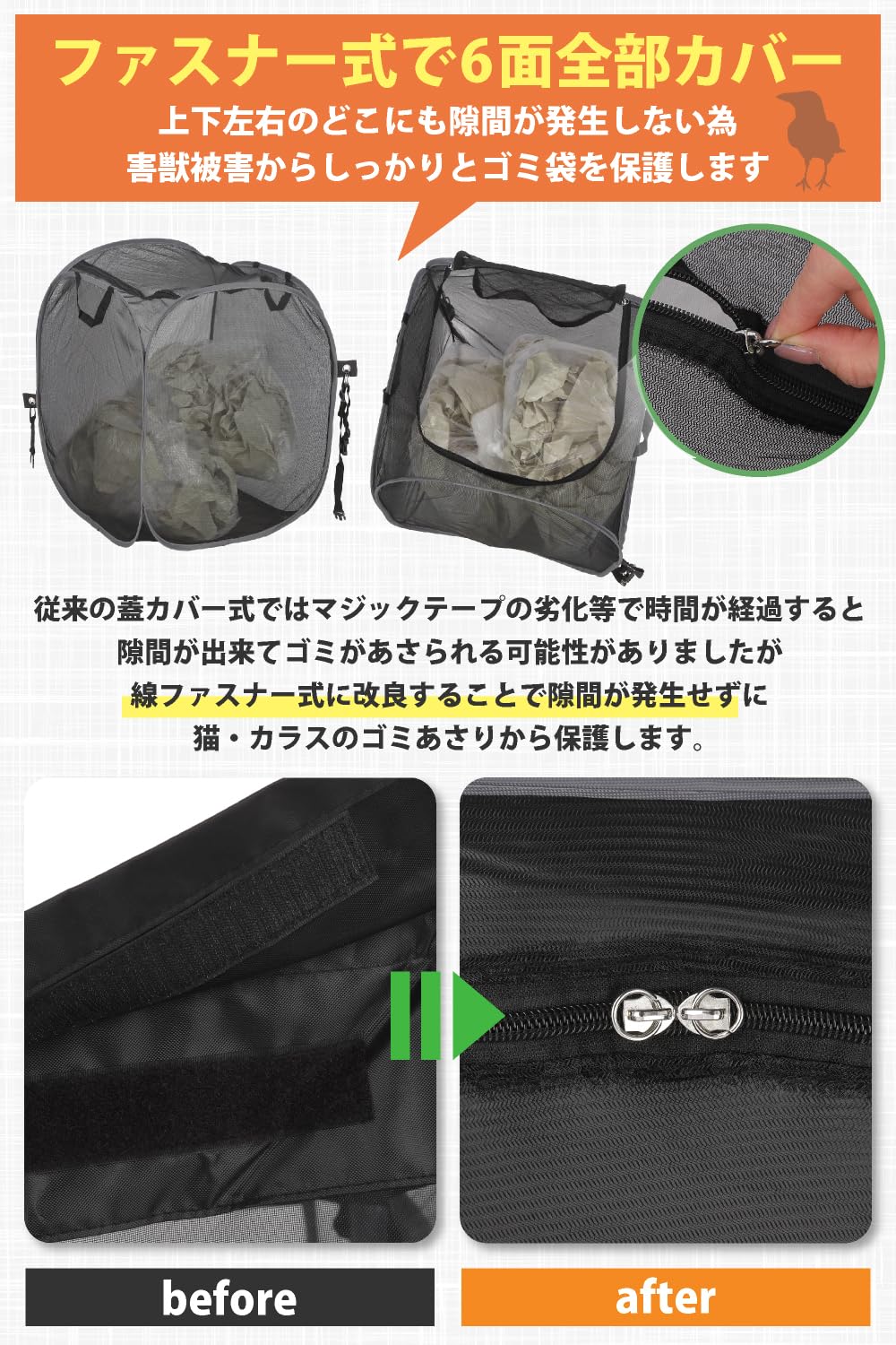 ??【隙間のない6面カバー】ダブルファスナー式で6面全部フルカバー。?上下横の何処にも隙間が発生しない為、ゴミ捨てネットとして害獣被害からしっかりとゴミ袋を保護します