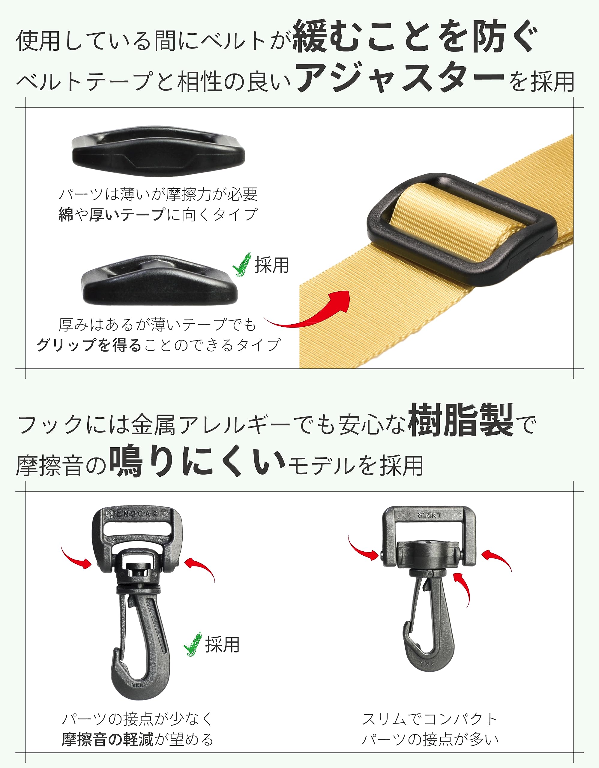 素材: [テープ] ナイロン、[パーツ] POM(ポリアセタール)