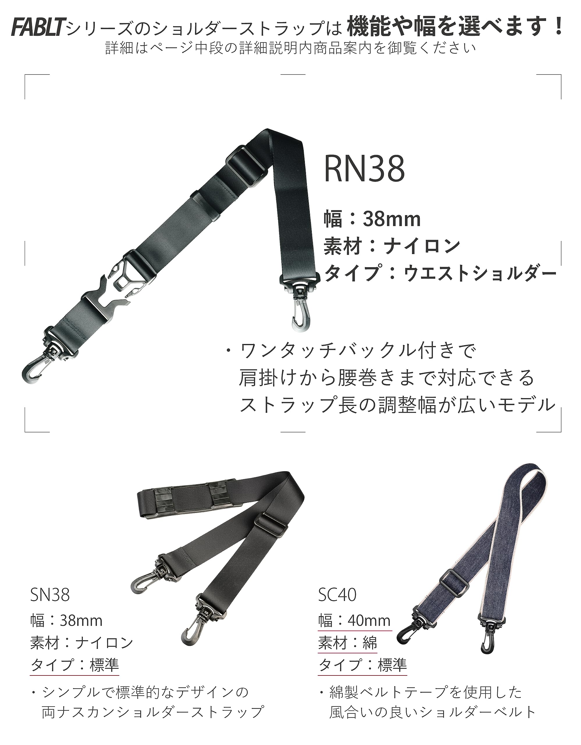 [ノーボーダー] FABLT サイドリリース ショルダーベルト ストラップ [日本製] [38mm幅] ブラック RN38MBK