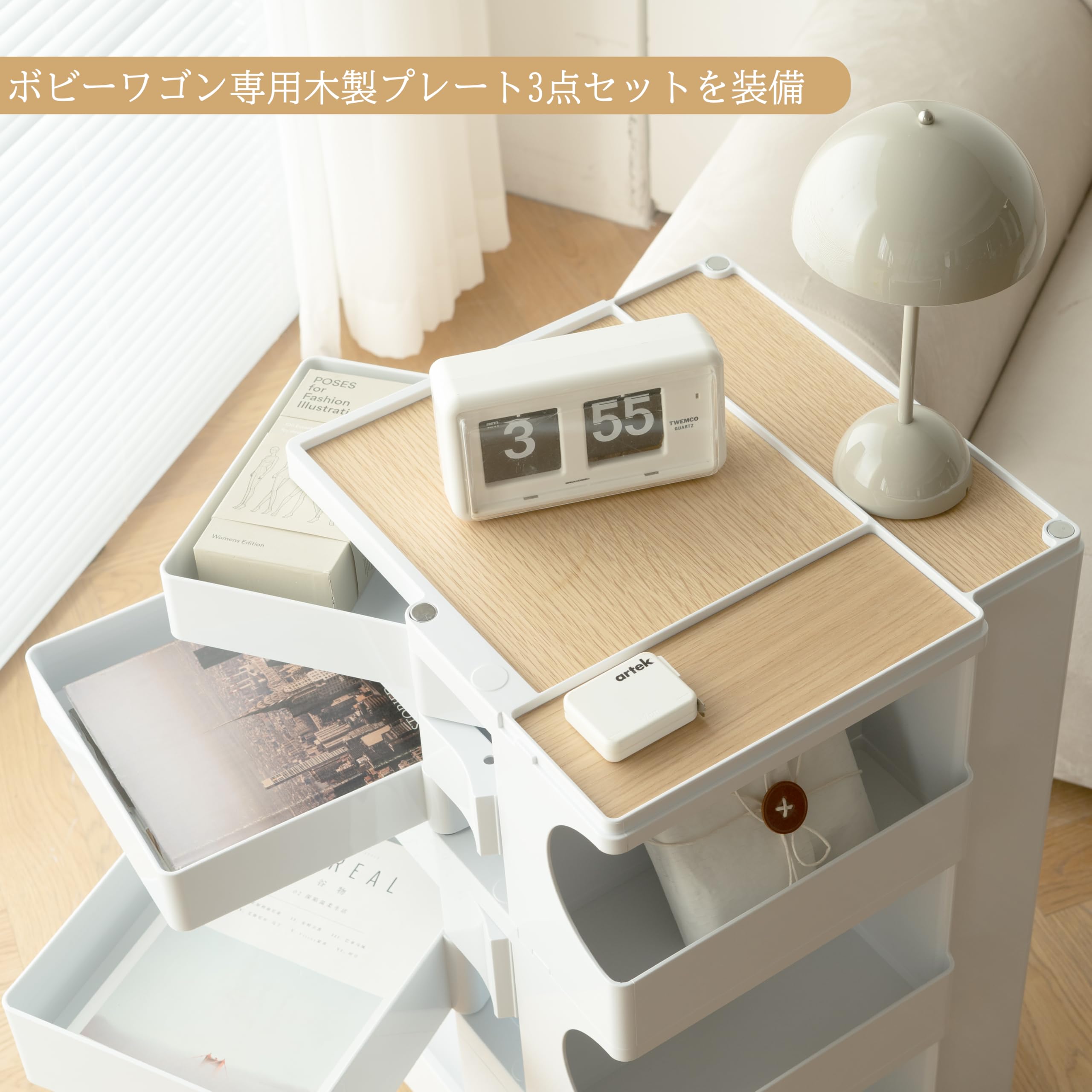 【数量限】ボビーワゴン レプリカ 回転式手押し車 2段 3段 5トレイロック式キャスター ボビーワゴン専用ウッドトレイ付き (ホワイト 3段5トレイ)