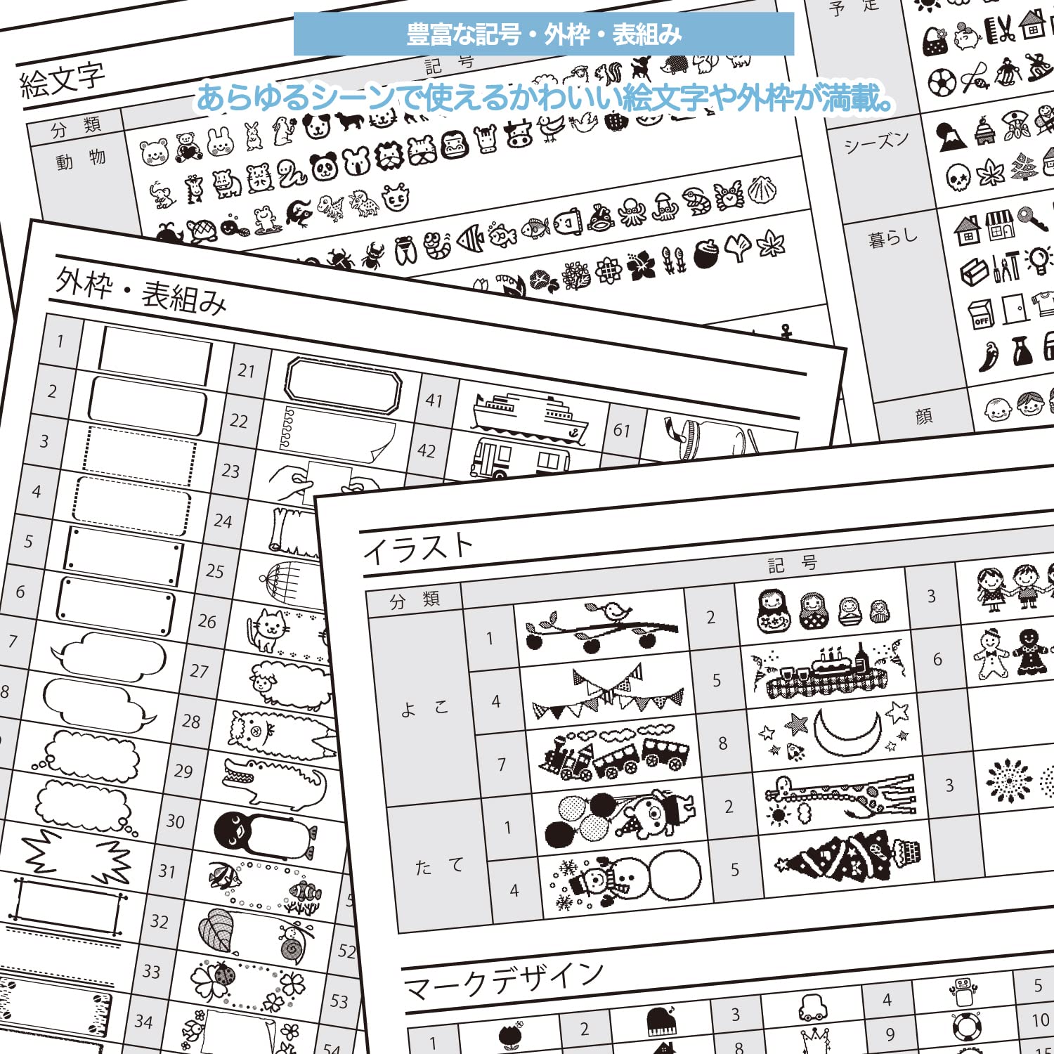 あらゆるシーンで使えるかわいい絵文字や外枠が満載。