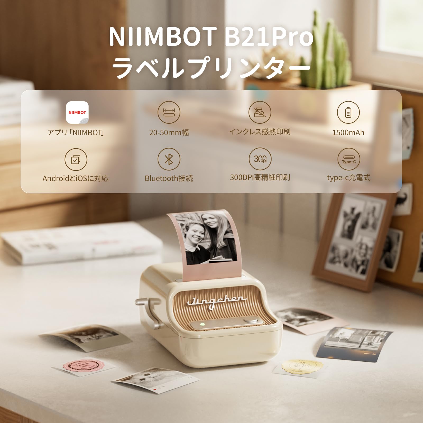 NIIMBOT B21Pro サーマルプリンター スマホ対応 ラベルライター 感熱ラベル Bluetooth接続 値札プリンター 小型 使いやすい 300DPI高精細印刷 用紙自動戻し AndroidとIOS対応 USB充電式 写真アルバム/手帳/メモ/買い物リスト/学習ノートに適用 専用アプリ ロール紙1個付き 日本語取扱説明書付き ホワイト