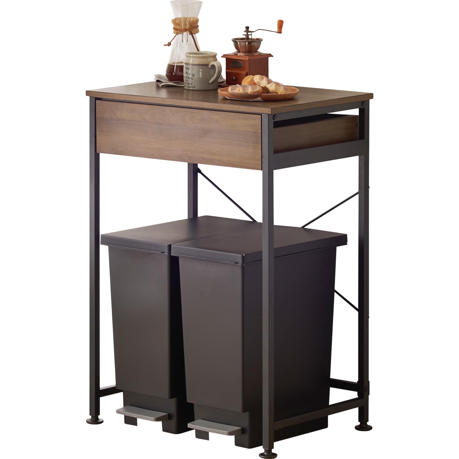 キッチン周りをスッキリ整理できる。デッドスペースを有効活用したゴミ箱上ラック。ゴミ箱を2個並べられるサイズ