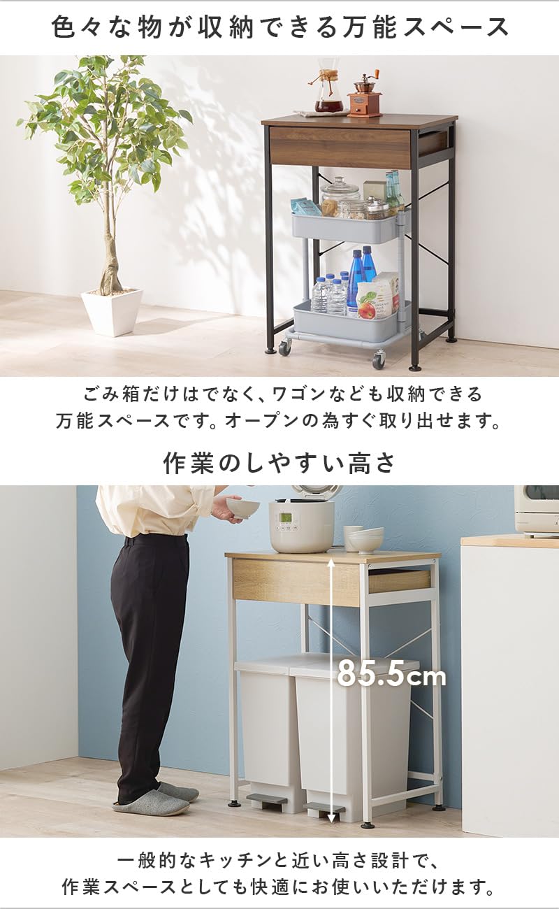 萩原 レンジラック ゴミ箱上ラック 引き出し付 【耐荷重30㎏】アジャスター付き レンジ台 幅60.5 奥行45.5 高さ85cm ブラウン KR-3770BR