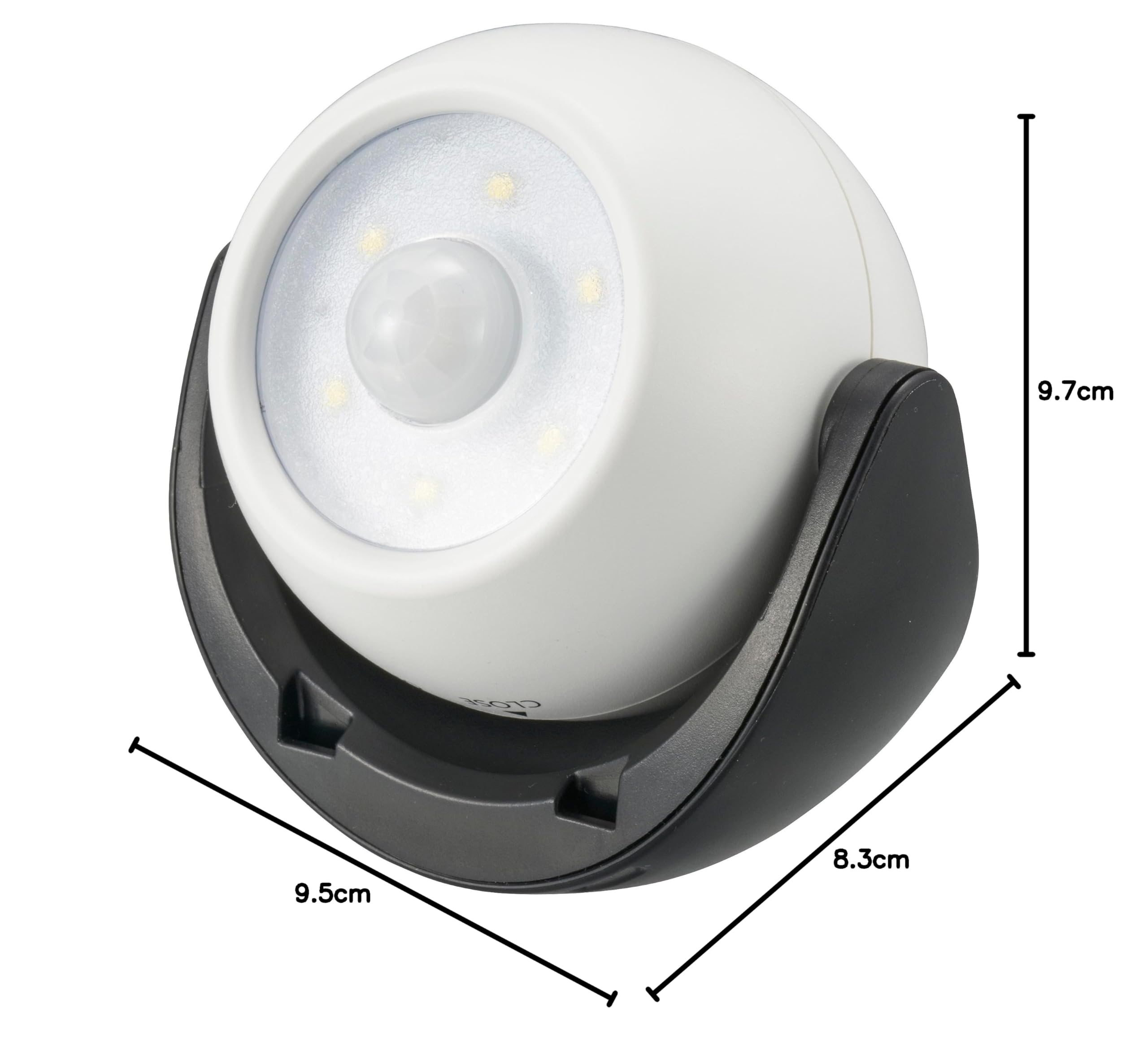 【 仕 様 】 ◆光源:LED×6個(交換不可)/昼白色 ◆全光束:約100ルーメン ◆人感センサー検知範囲:約5m 上下約90° ◆点灯保持時間:約10秒 ◆スイッチ切替機能:AUTO/OFF/ON ◆電源:単3形乾電池×3本(乾電池別売)