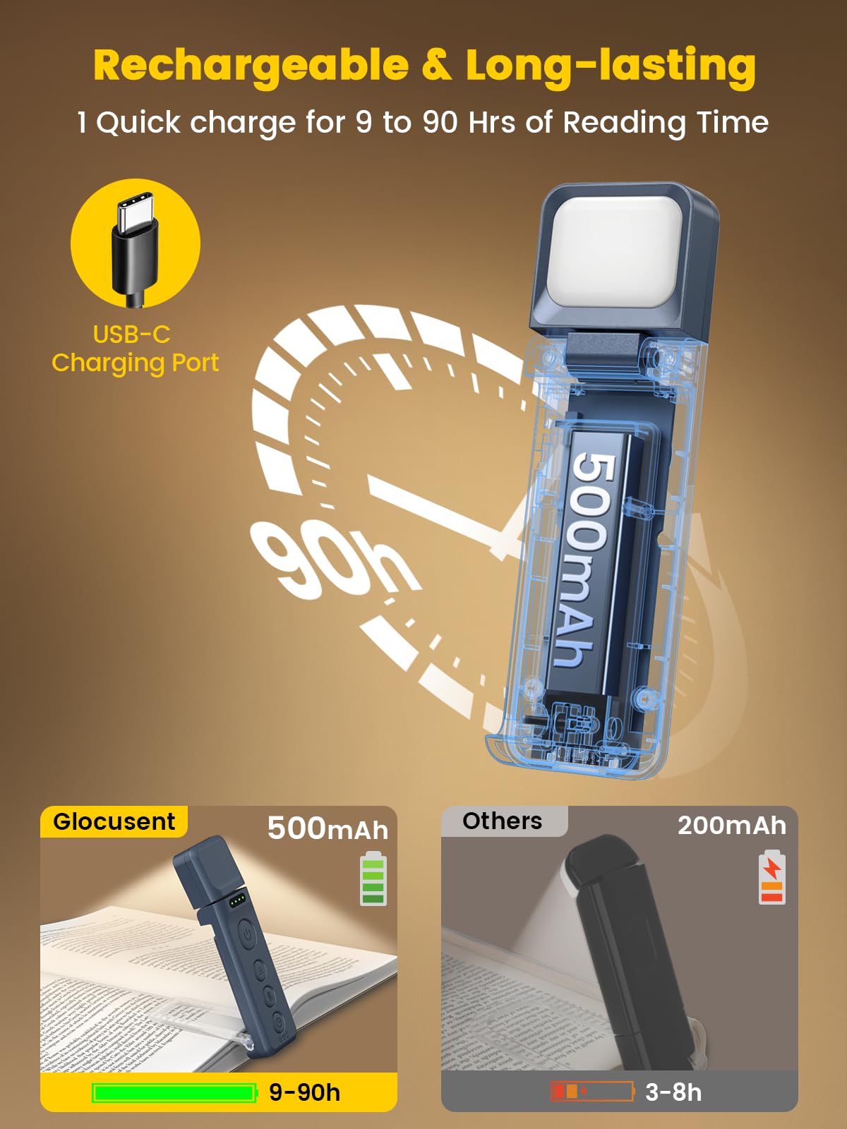【USB充電&長時間使用】Glocusent 読書ライトはUSB-C充電式。500mAhのバッテリーで最大90時間連続使用可能。クリップブックライトとして持ち運びやすく、ベッドでの読書や旅行中にも便利です。
