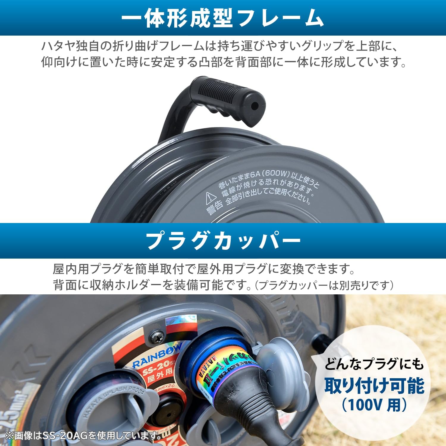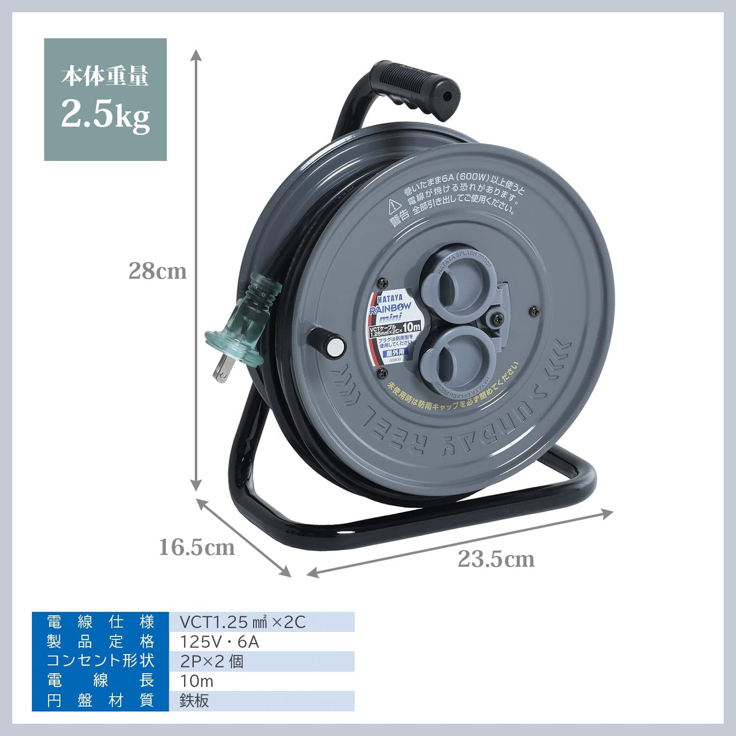 【特価在庫】【 限定】 ハタヤ (HATAYA) コードリール 小型 屋外用 (防雨型) 100V型 コード10m 太さ1.25? 標準型 コンセント2個 コンセント防雨キャップ 家庭用 工場用 建設現場 サンデーレインボーリールミニ SS-10AG グレー