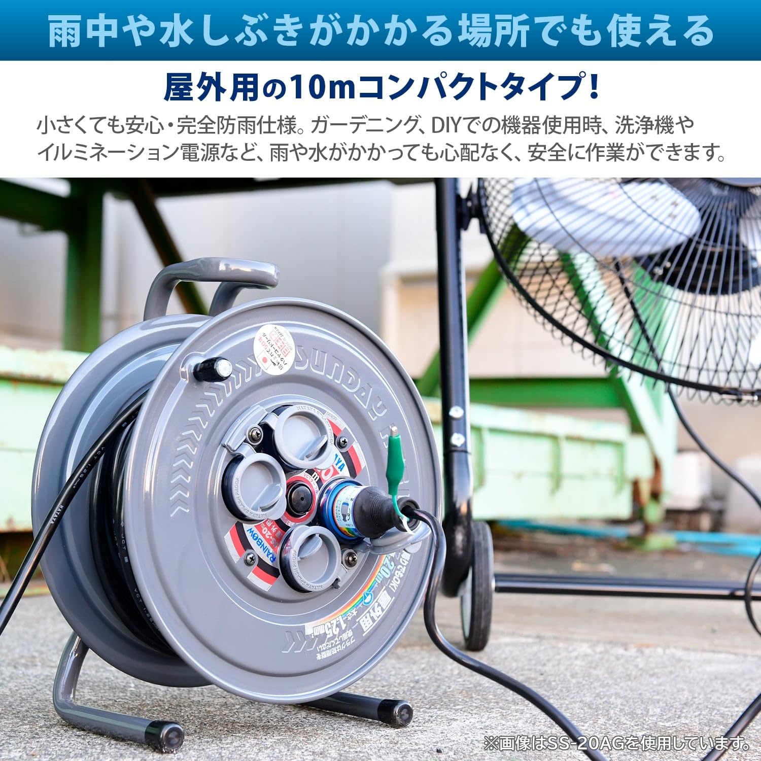 ●雨中や水しぶきがかかる場所でも使える屋外用の10mコンパクトタイプのコードリールです。