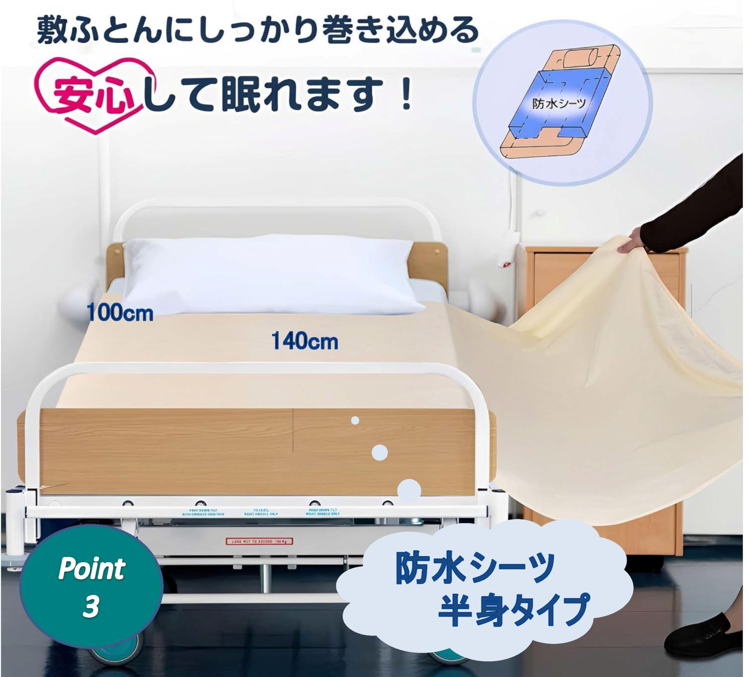 『半身タイプ・部分タイプ』防水シーツ 介護・半身用タイプで、汚れでも交換や洗濯はシンプルになり、負担が軽減できます、表面の吸水性に優れた綿パイルを使用しており、介護施設から在宅介護まで幅広くご使用頂けます。