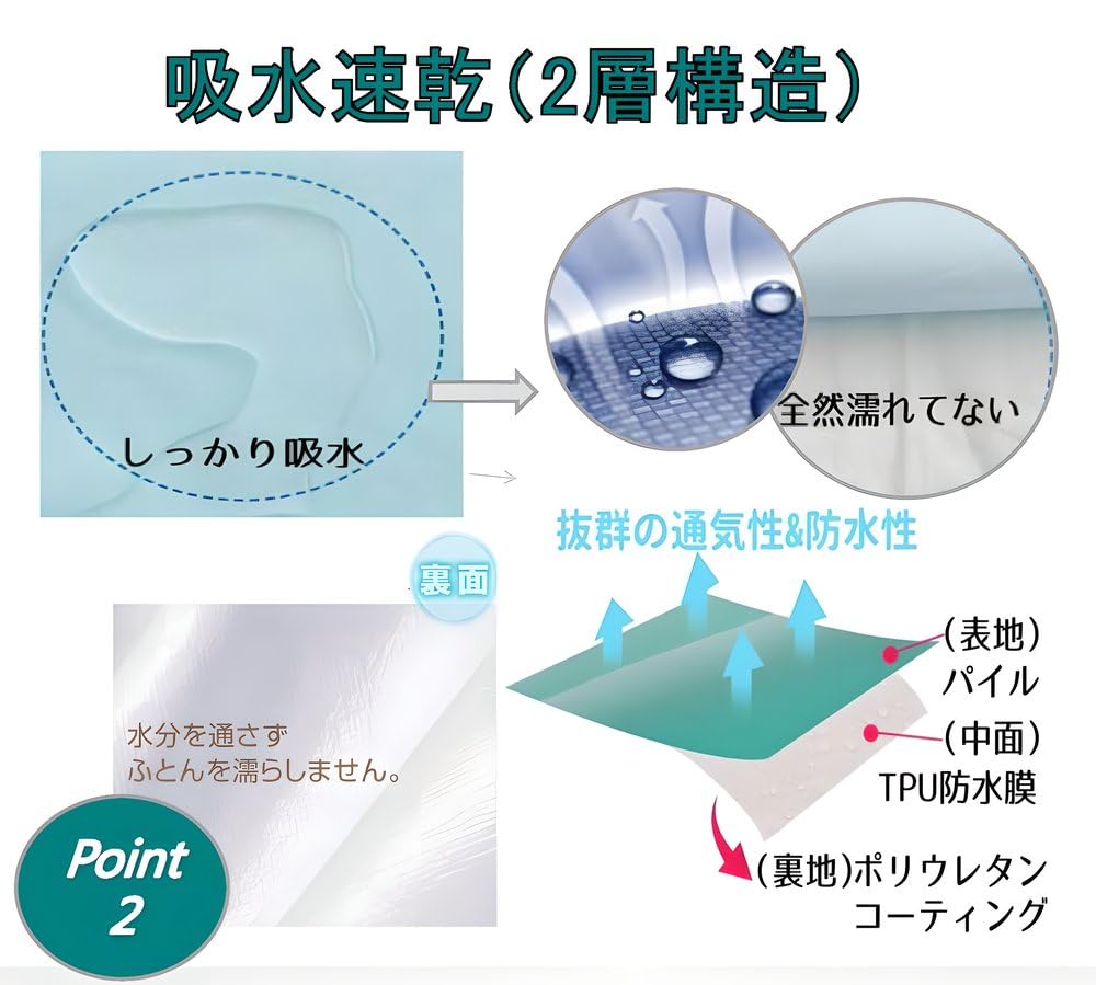 『優れた素材・綿100%』おねしょシーツ 表地は吸水性に優れた安心の綿100%、パイルはさらっとした肌触りで空気に触れる表面積が広いため乾きが早く、カビの発生やニオイの発生を抑制するので衛生的。 通気性、汗の吸水率を良くし、嫌なジメジメ感を解消し、毎日の睡眠を心地良くします