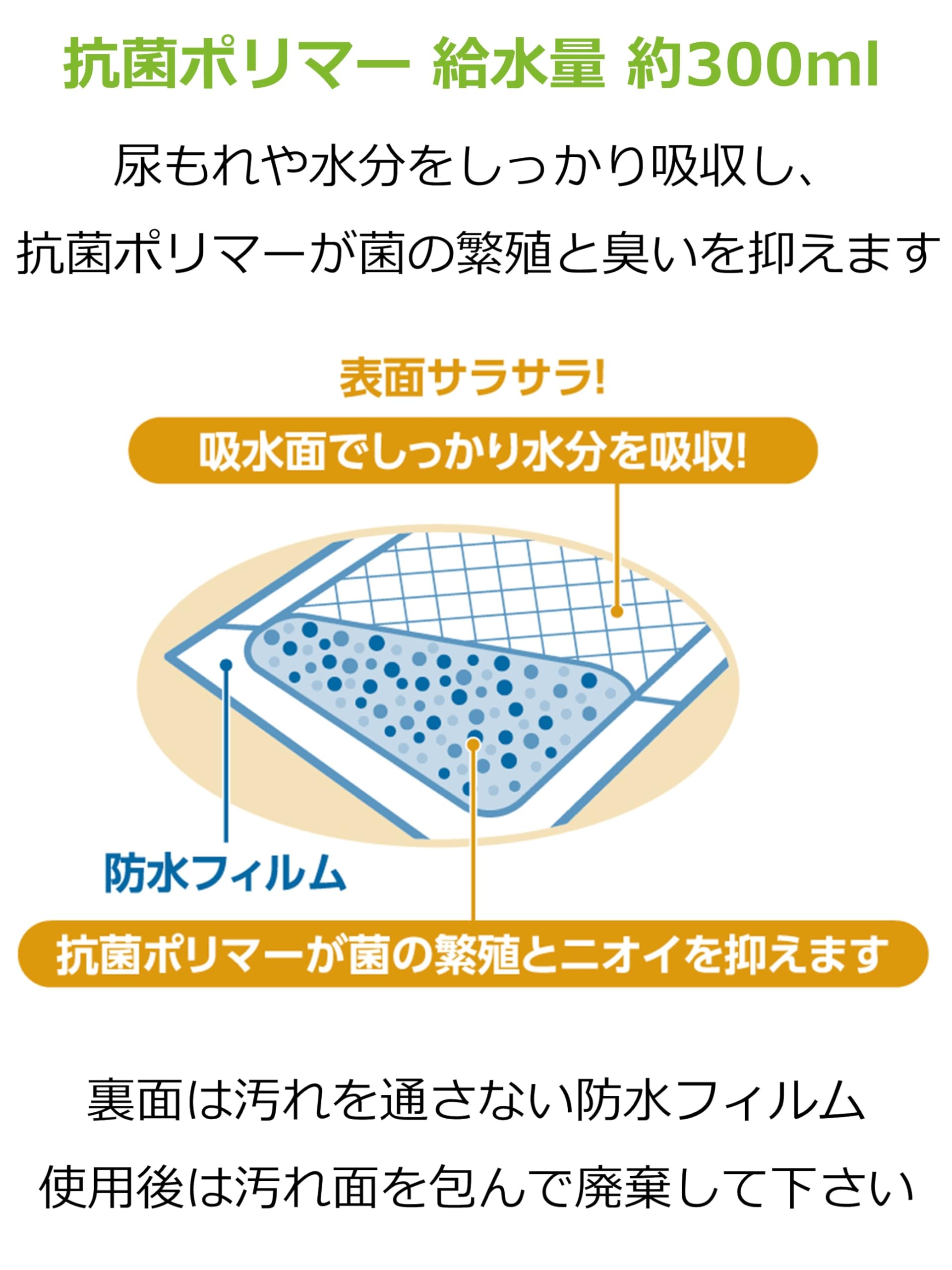 【 安心 】吸水量:おしっこ二回分約300ml(一回の排水量を150ccとして)。抗菌ポリマーが菌の増殖と臭いを抑えます。