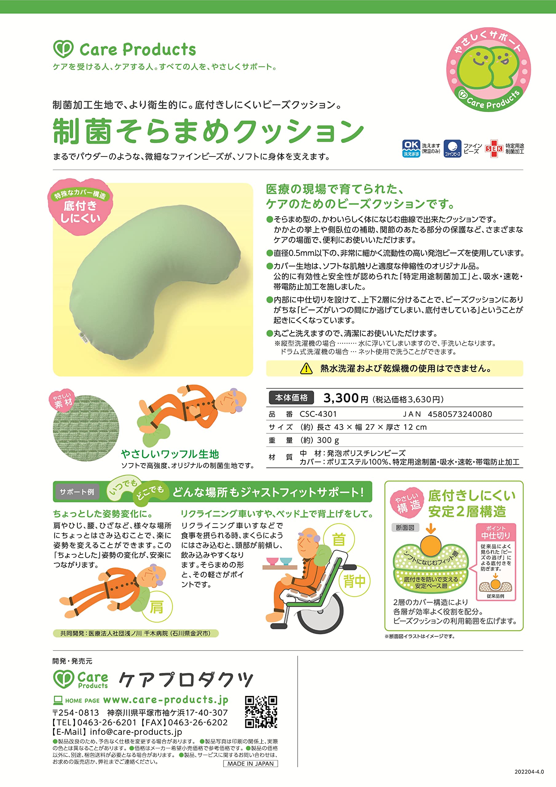 ●直径0.5mm以下の微細な発泡ビーズを使用した、ソフトで優しいクッションです。●特定用途制菌加工が施された生地を使用しています。●特殊なカバー構造で、底付きしにくくなっています。
