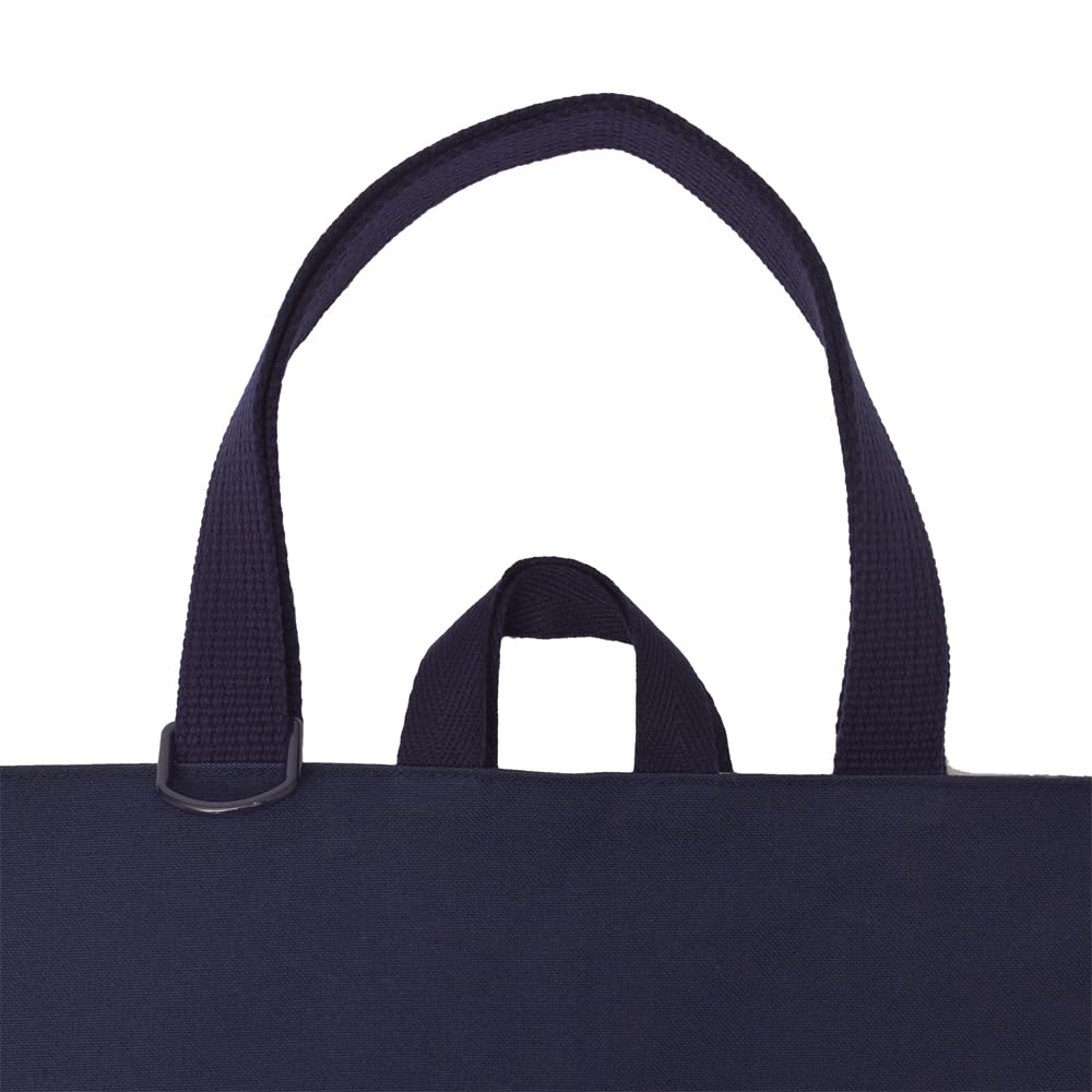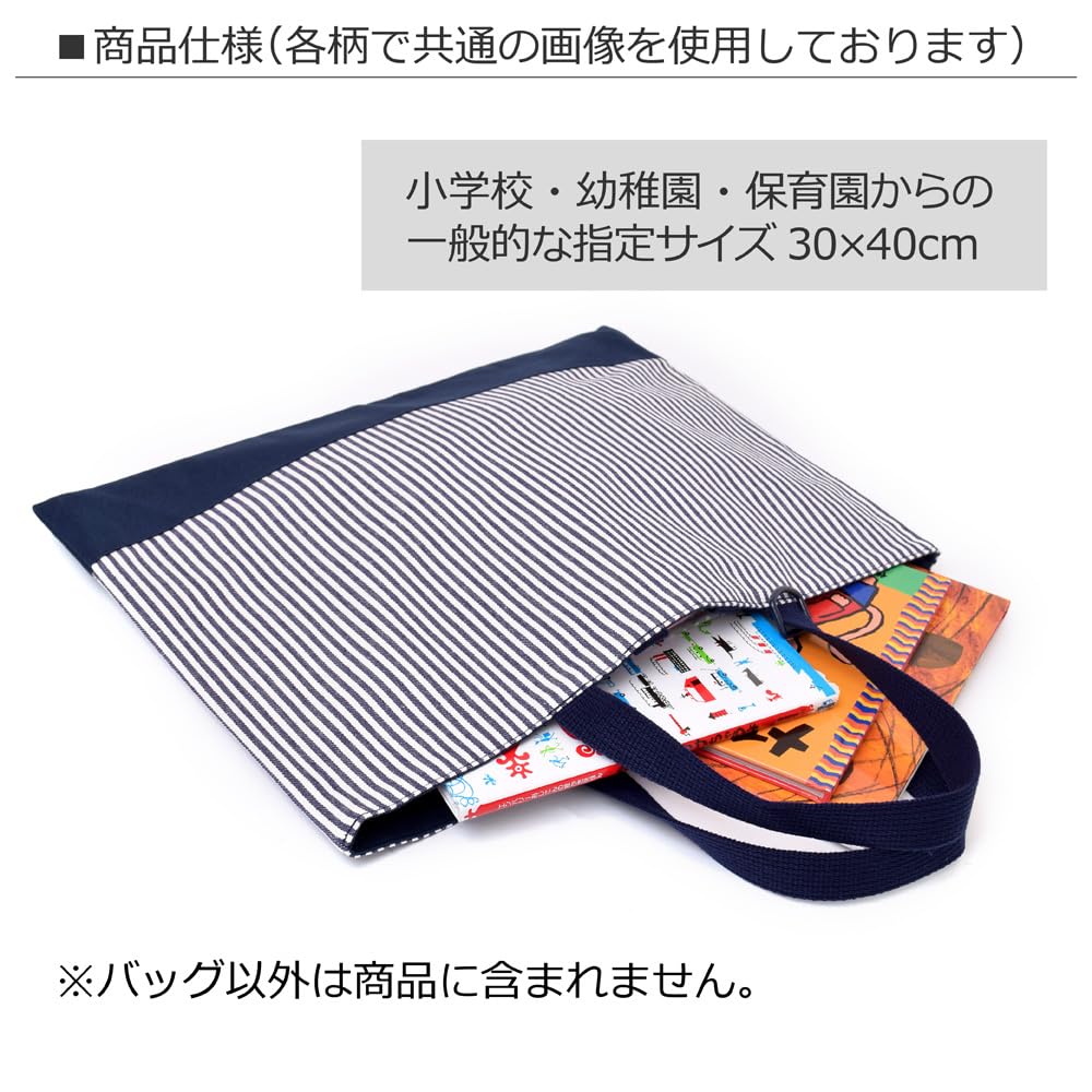 大判の絵本やスケッチブックなどがすっぽり入る定番サイズ。名札を付けるDカンも付属しています。