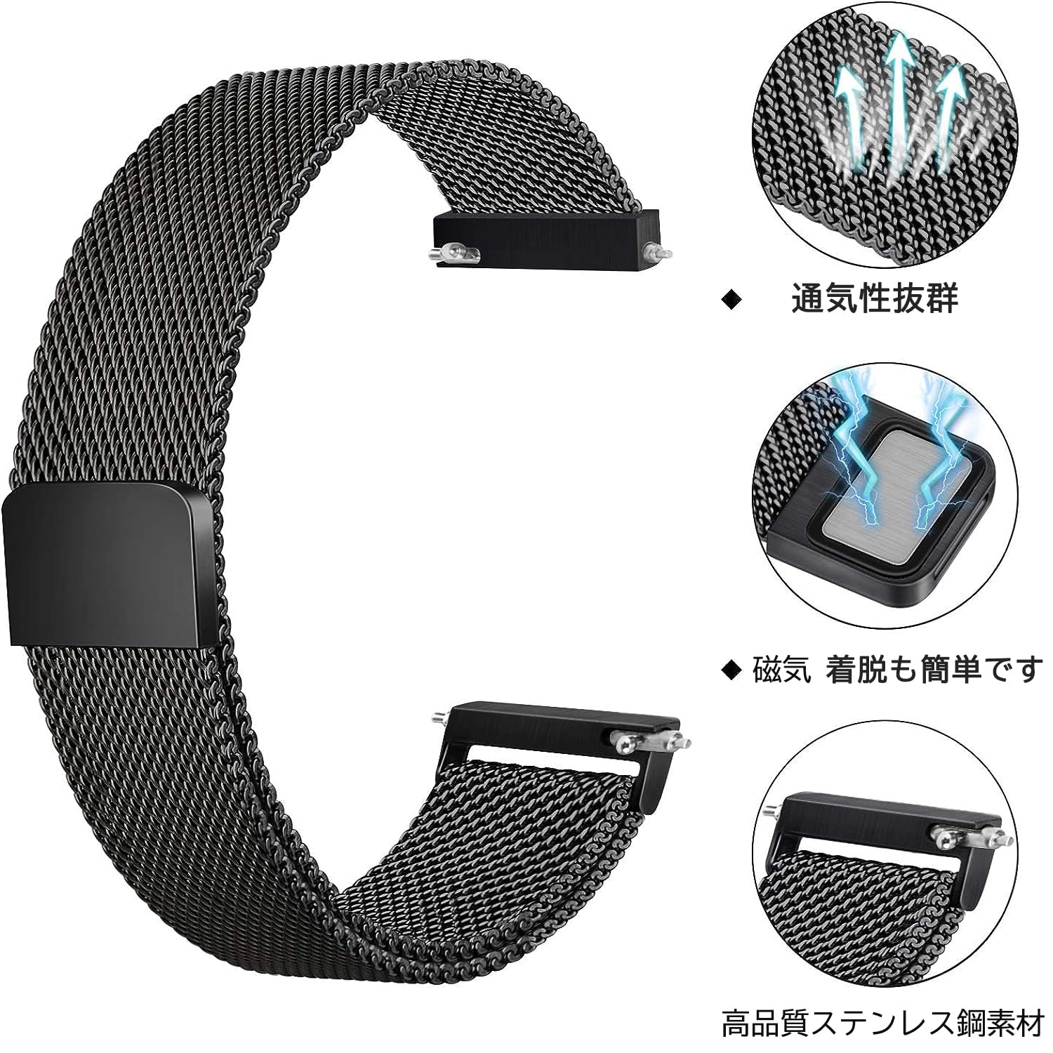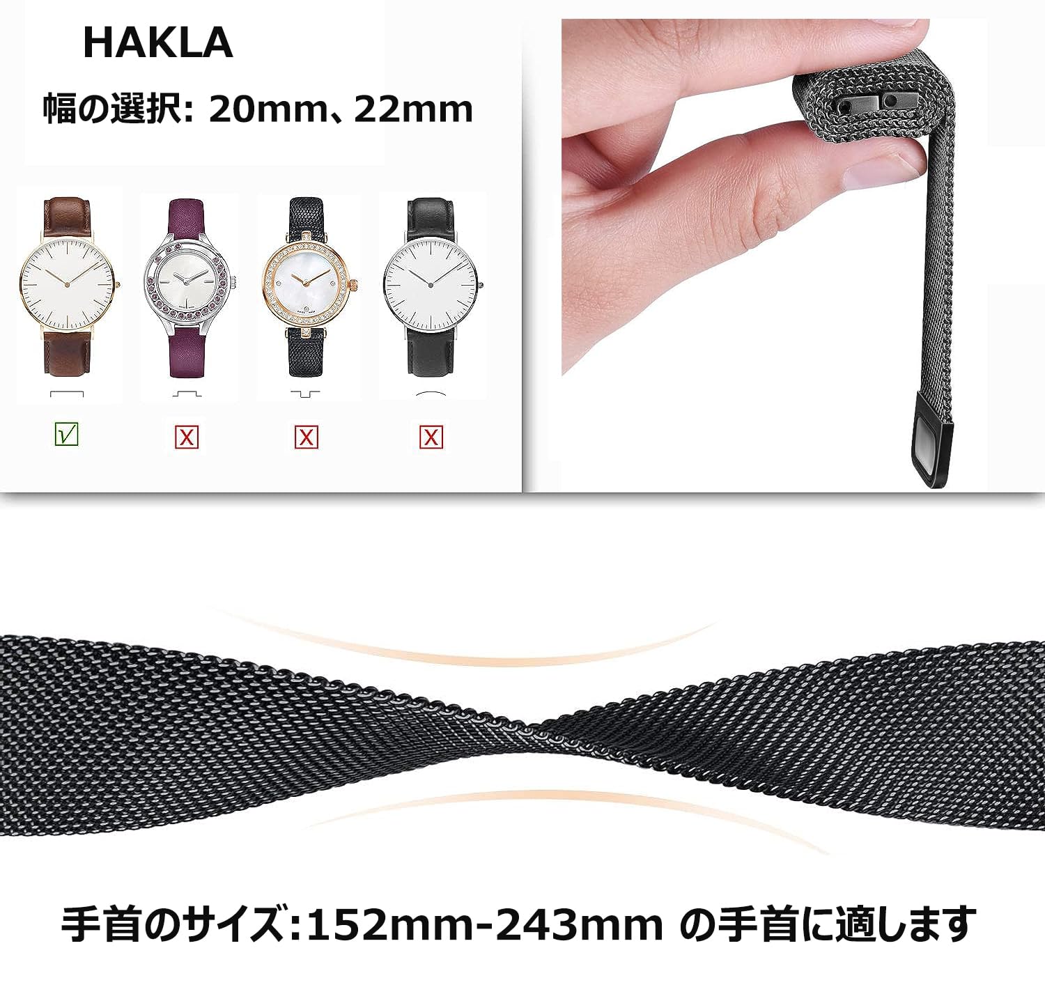 [HAKLA] 時計バンド 22mm 20mm マグネット式腕時計バンド スマートステンレス留め金製 男女兼用 交換ベルト メッシュバンド ミラネーゼバンド