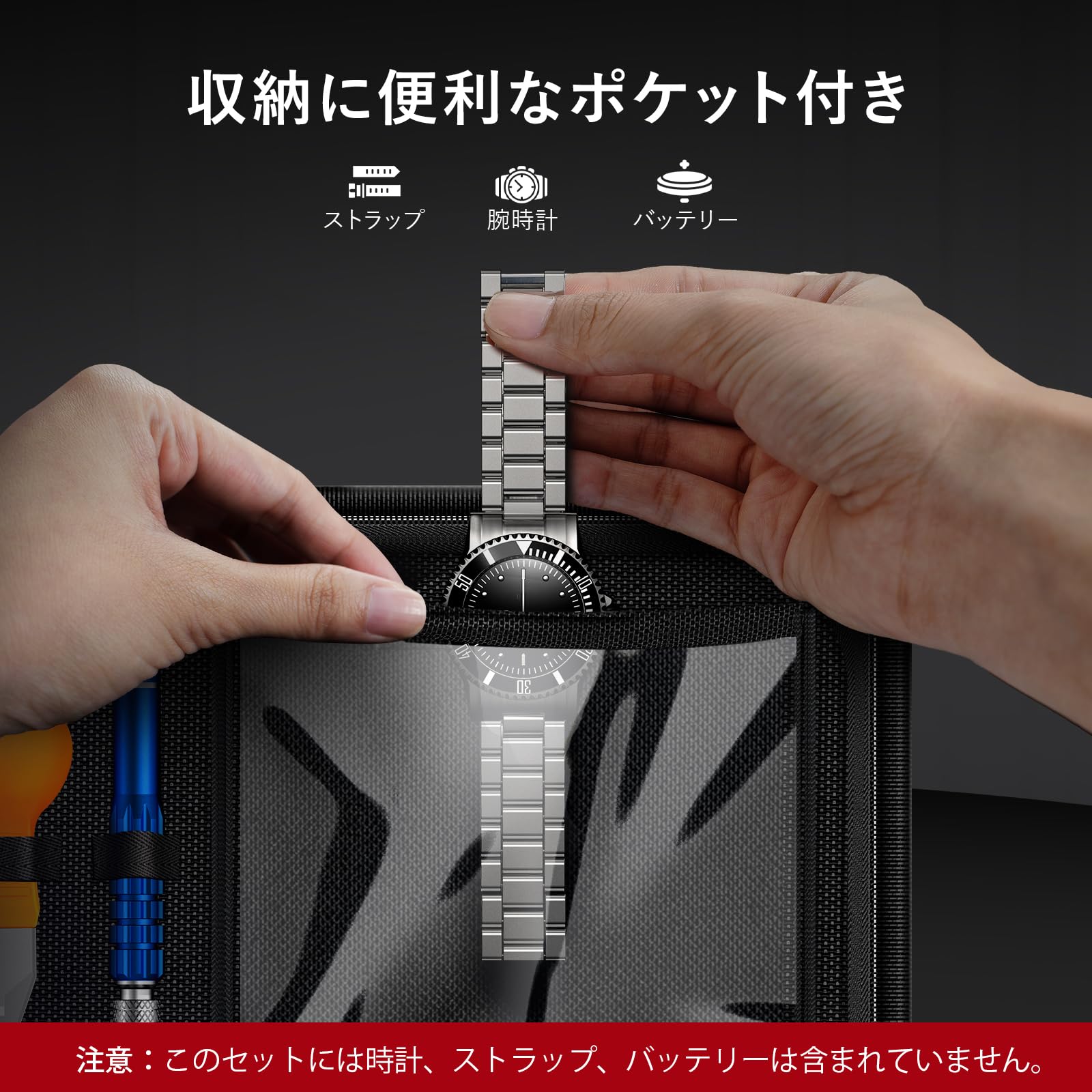 【収納と持ち運びが簡単】①このファスナーポーチは、すべての修理工具を収納できるだけでなく、透明なストラップが内蔵されており、取扱説明書や予備バッテリー、予備ストラップなどを収納することができます。②注)ポーチは収納可能なもののみで、時計、ストラップ、電池はセットされていません。③持ち運びに便利なヒモ付き。