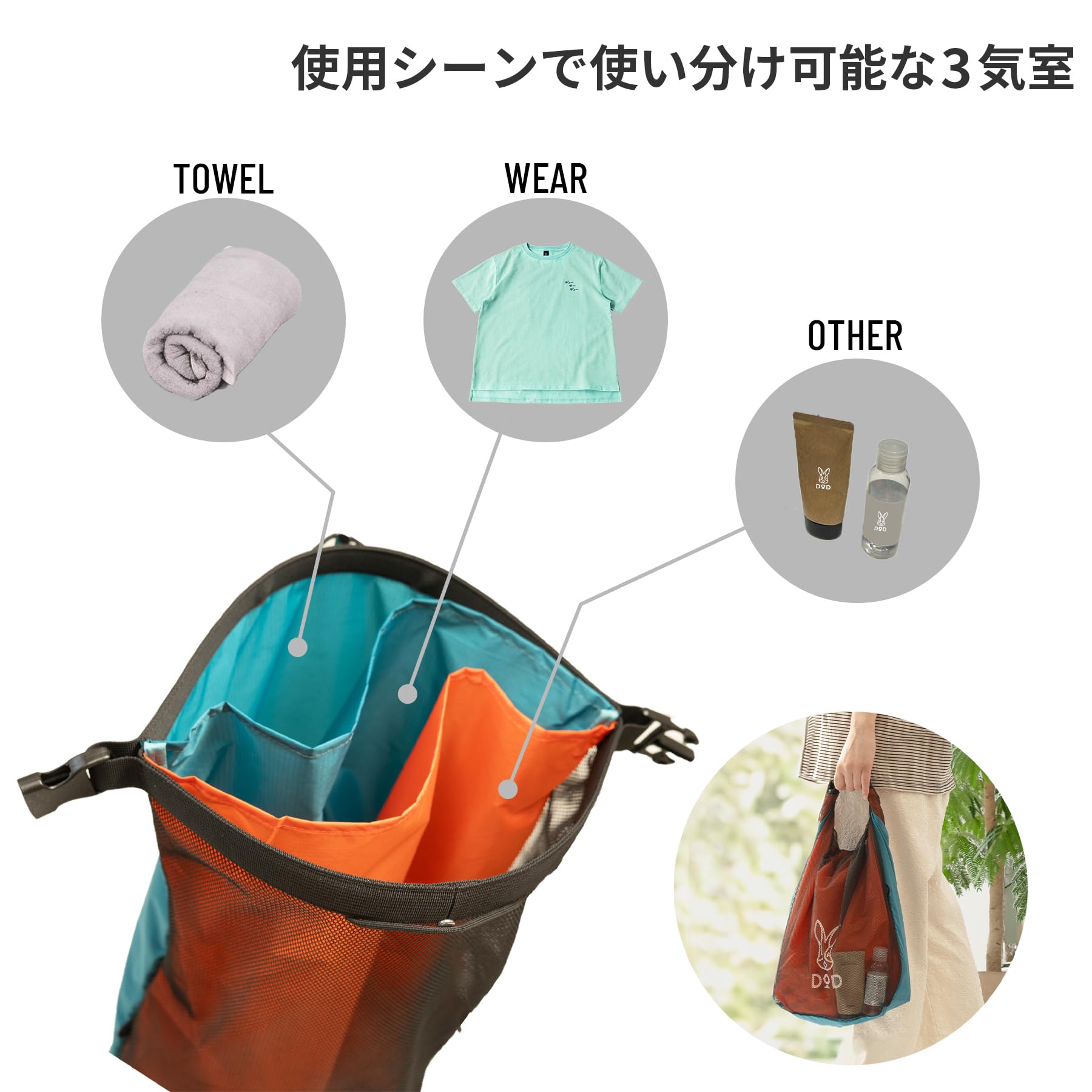 キャンプでのお風呂など、着替えを入れたまま持ち運ぶことができます。
