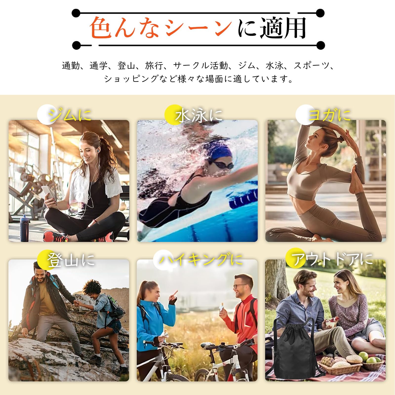 【便利な引き締め設計】バッグはシンプルで使いやすい巾着式デザインを採用しており、紐を引っ張るだけで簡単に開閉できます。閉じるときは紐を引くだけ、開けるときは口元を引くだけで手軽に利用できます。肩ひもの長さも自由に調整可能で、紐の下に結び目を作ることで簡単に調整できます。使わないときはコンパクトに折りたたんで収納できるため、外出先での持ち運びに便利です。