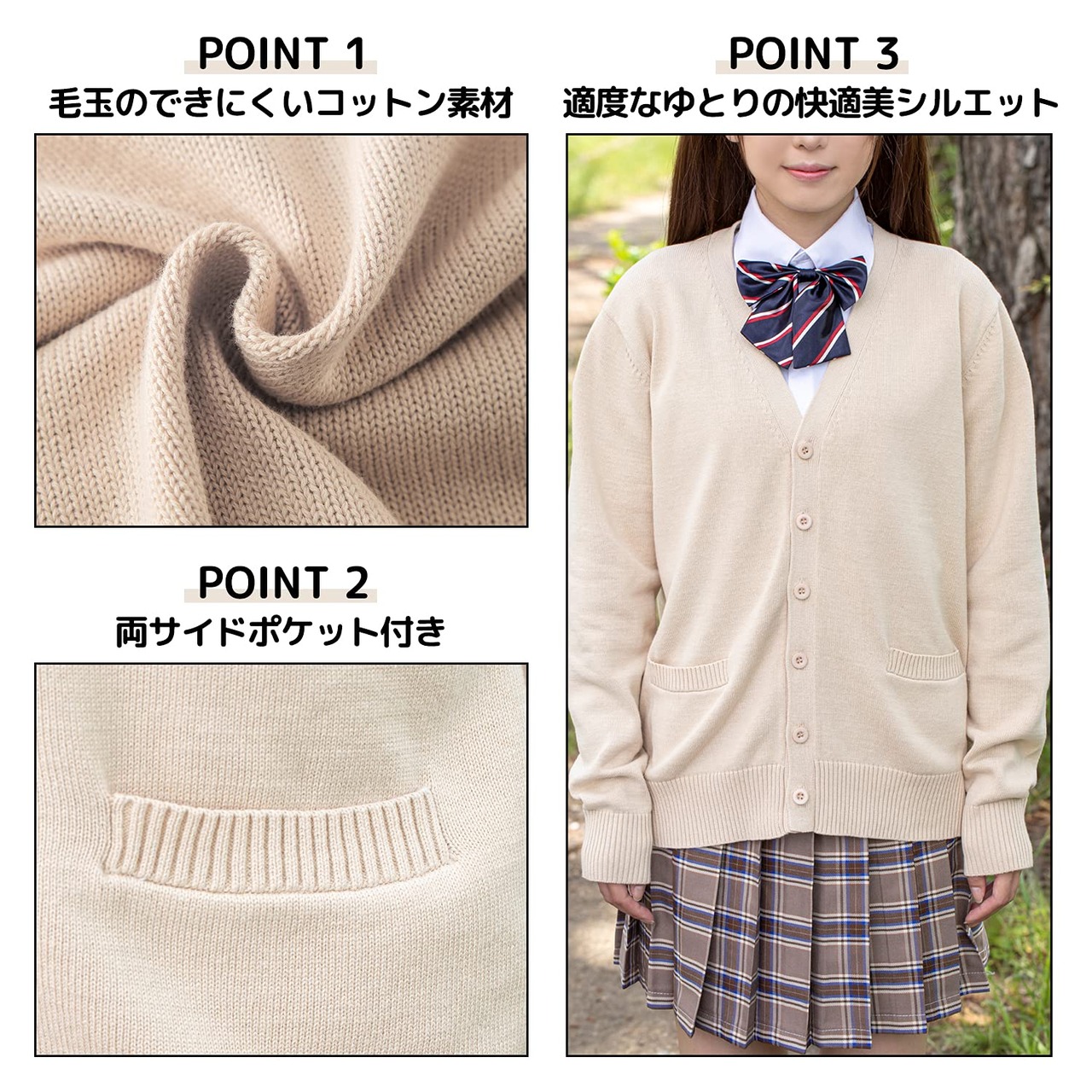 毛玉ができにくい:コットン素材のニットのためウールやアクリルよりもへたりにくく、毛玉ができにくいです。