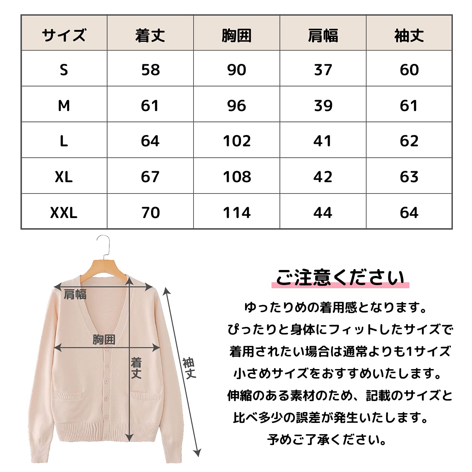 各サイズ寸法:XS:着丈58、胸囲:90、肩幅:37、袖丈:60 S:着丈61、胸囲:96、肩幅:39、袖丈:61 M:着丈64、胸囲:102、肩幅:41、袖丈:62 L:着丈67、胸囲:108、肩幅:42、袖丈:63 XL:着丈70、胸囲:114、肩幅:44、袖丈:64