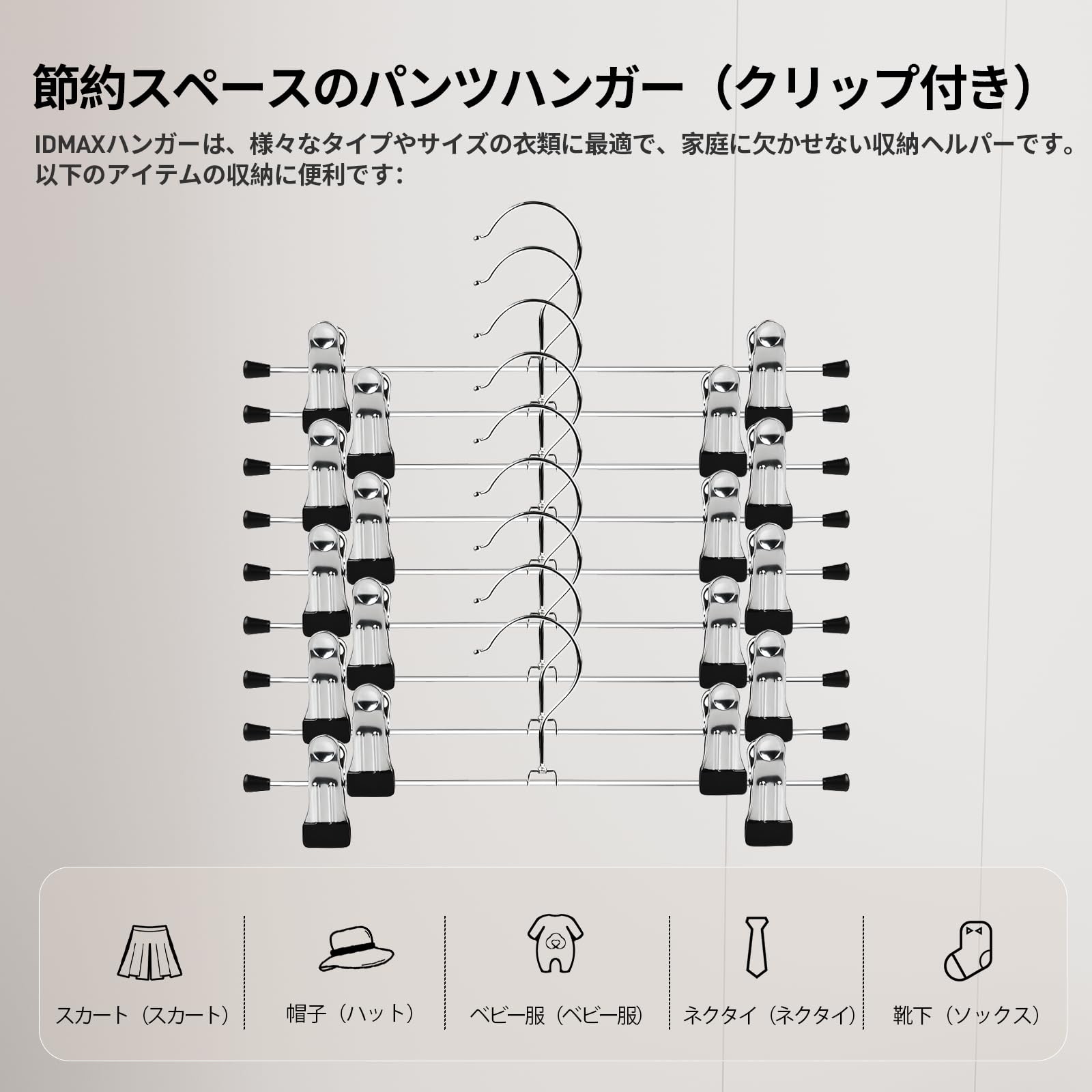 ?【最高品質の金属素材】--- ID MAXのクリップ付きパンツハンガーは、優れたステンレススチール素材(亜鉛合金メッキ-錆びにくく、色あせしにくい)。 金属製のズボンラックは木製またはプラスチック製のズボンハンガーよりも耐久性があります。