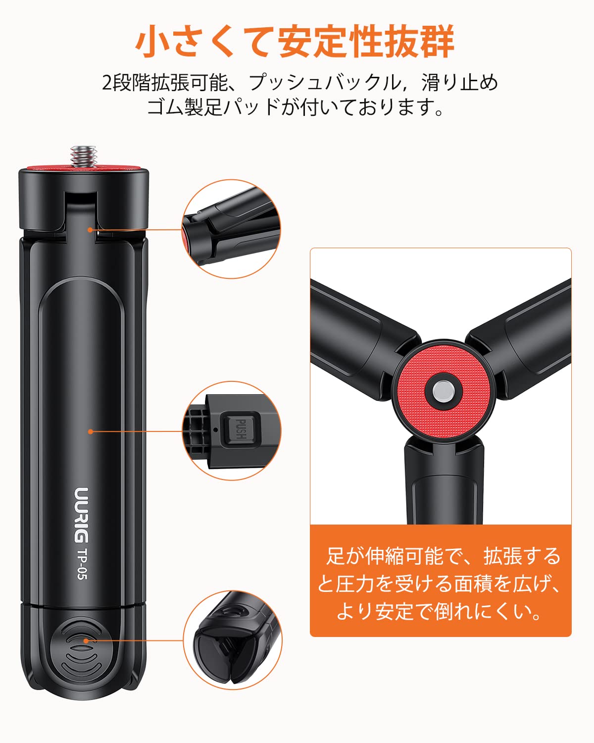 ?【2段階伸縮可能な足】ミニ三脚は異なる高さのデバイスに満たすために、2つのモードに設計されています。圧力を受ける面積を拡大でき、デバイスをより安定になります。ご注意:拡張した後、安定性が上がったが、耐荷重が下げることがあります、推奨耐荷重2Kgです。