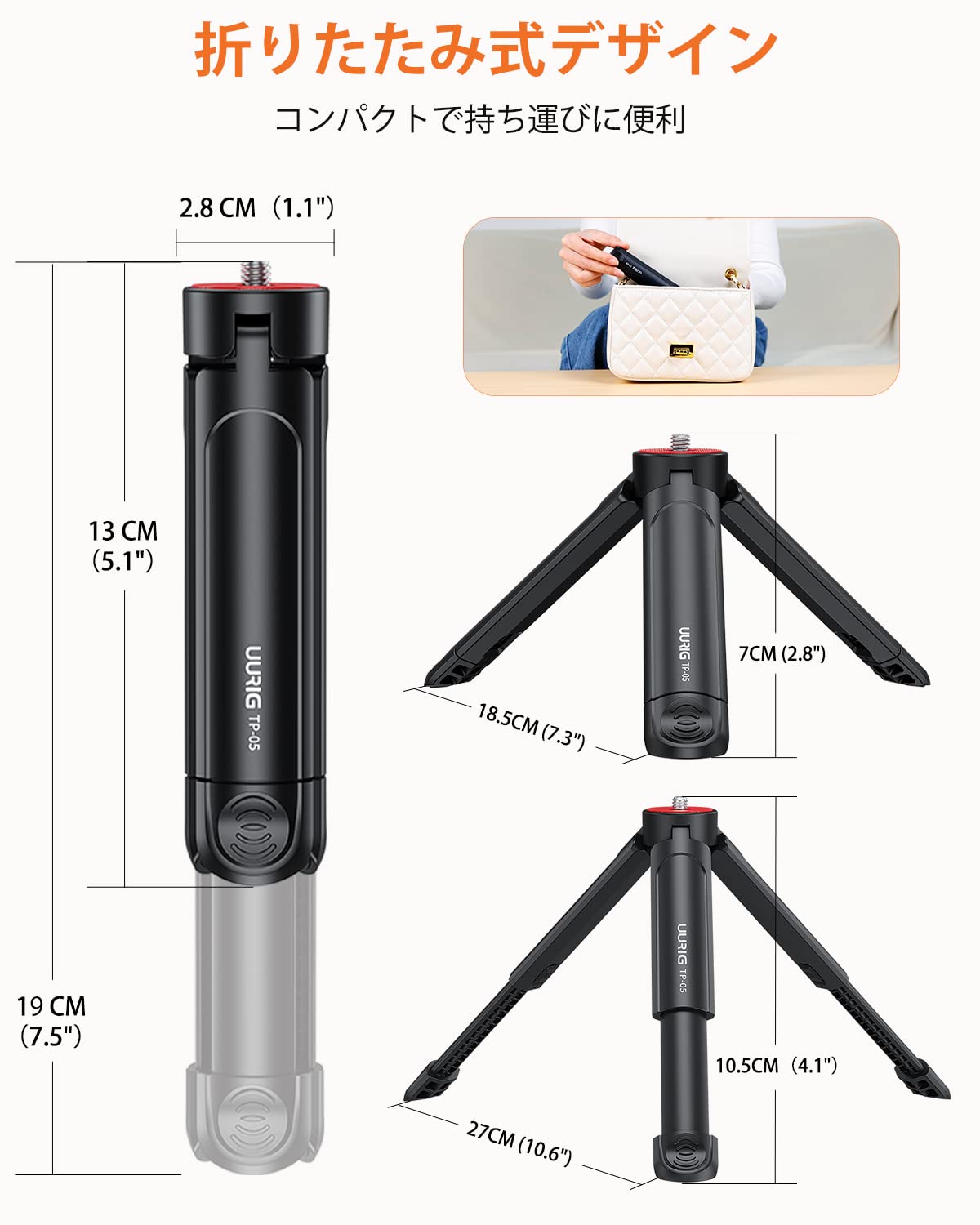 UURIG ミニ三脚 卓上 カメラ 三脚 カメラスタンド 1/4インチネジ スマホ ジンバル スタンド 小型 軽量 伸縮可能 折りたたみ コンパクト 持ち運びに便利 マイクロ三脚 シンプル 耐荷重2kg ブラック