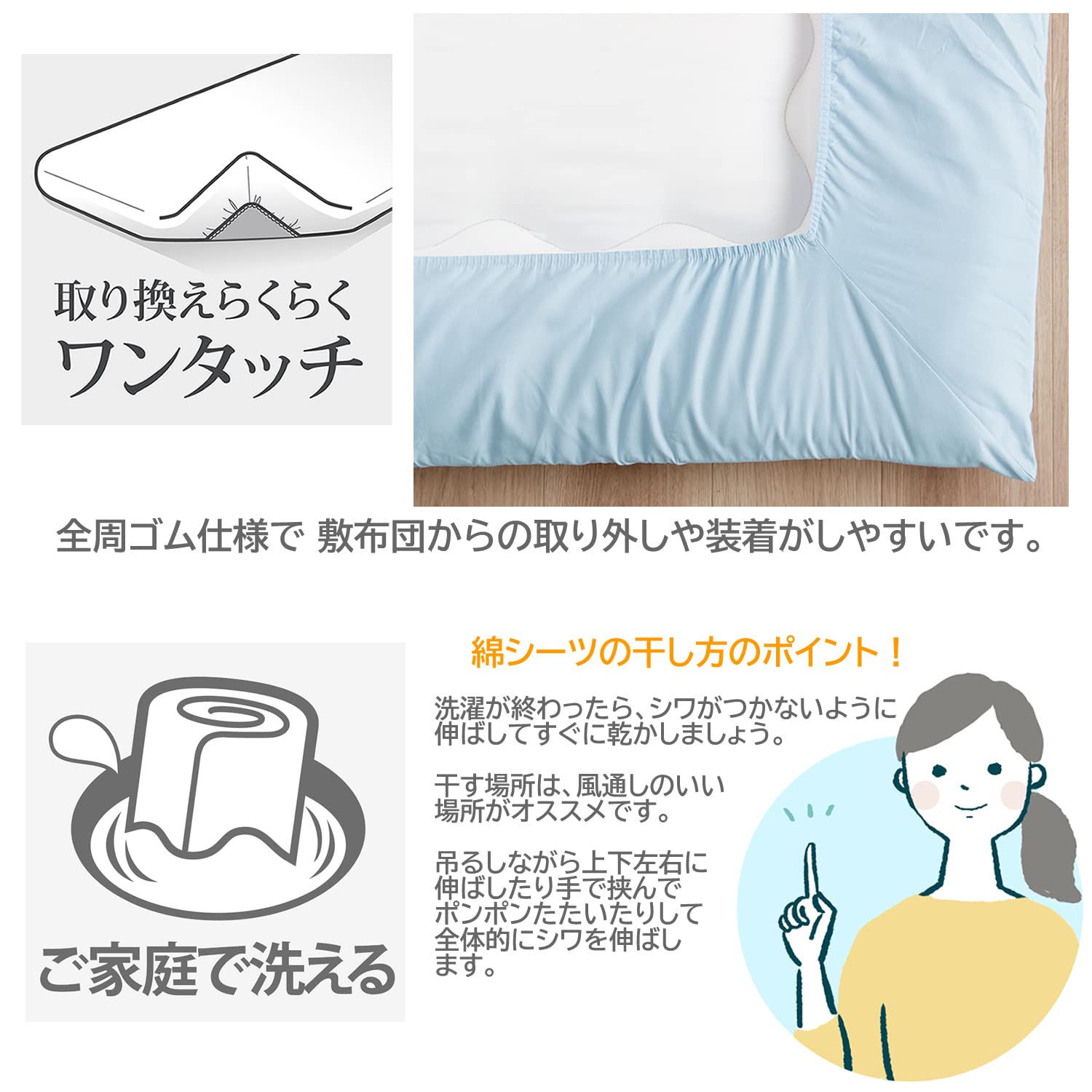 全周ゴム仕様で 敷布団からの取り外しや装着がしやすい。