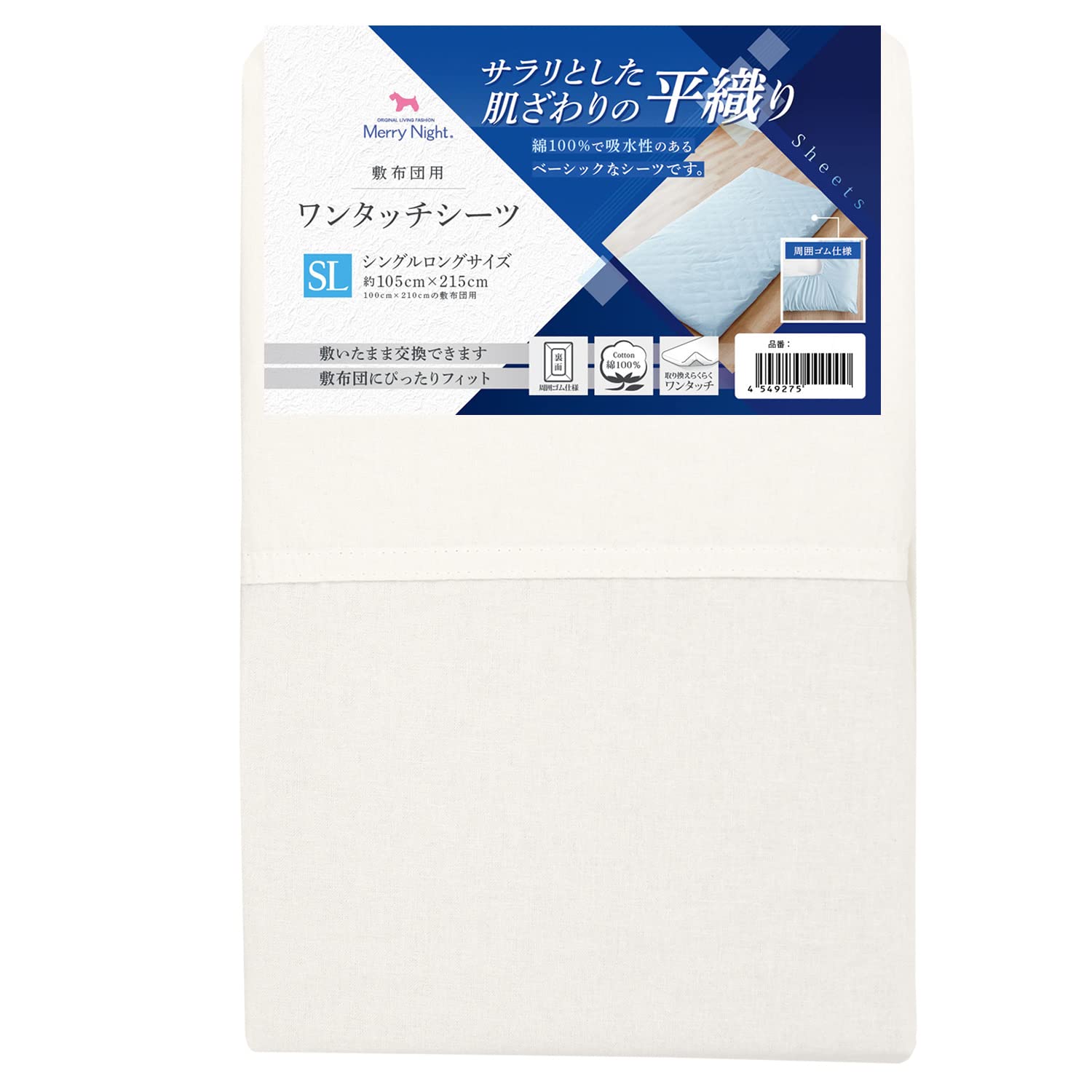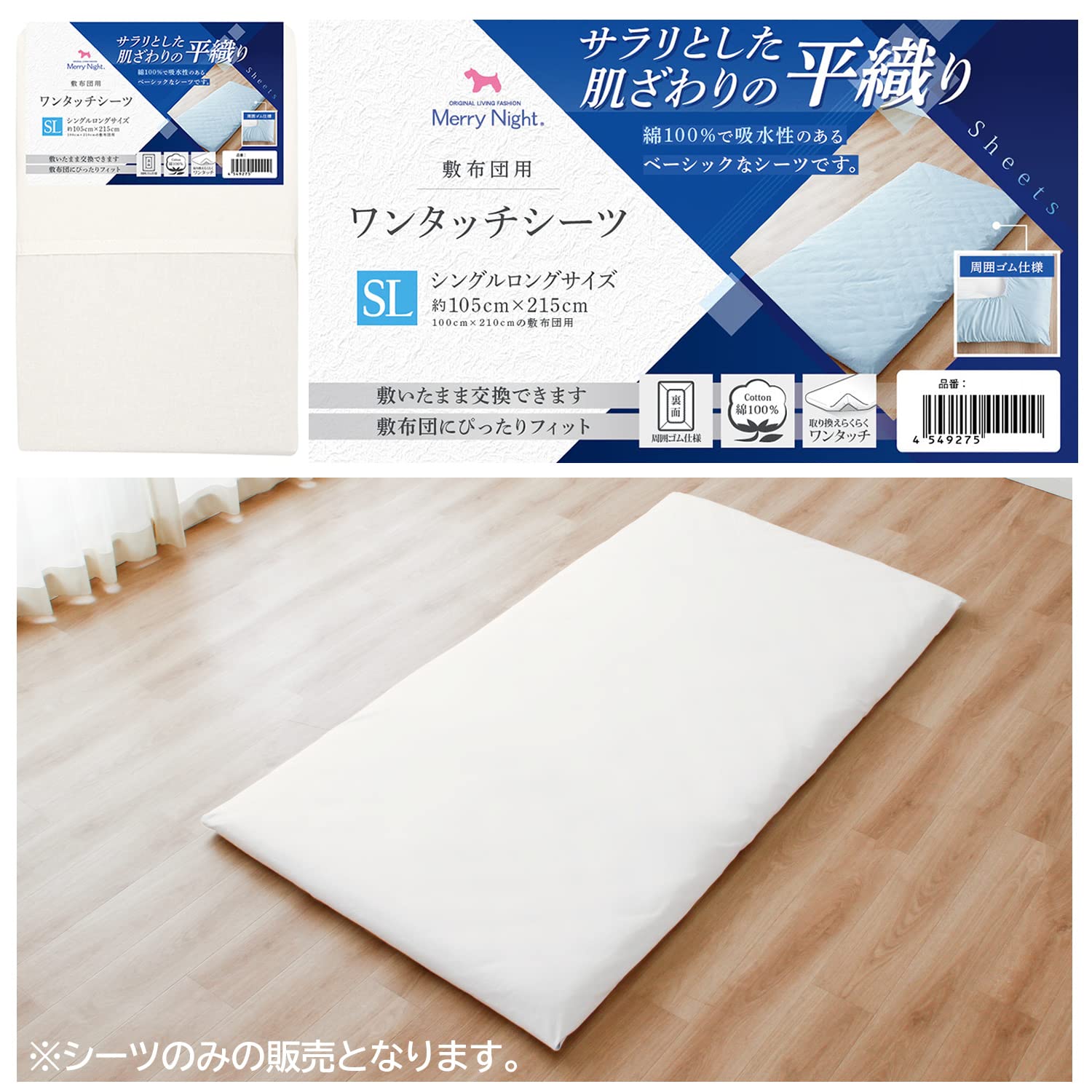 【数量限】メリーナイト シーツ ワンタッチシーツ 平織生地 ホワイト 敷布団用 シングルロング 約105×215cm 綿100% ベーシック生地 サラリとした肌ざわり オールシーズン 洗える 362001-06 | GIGATERA