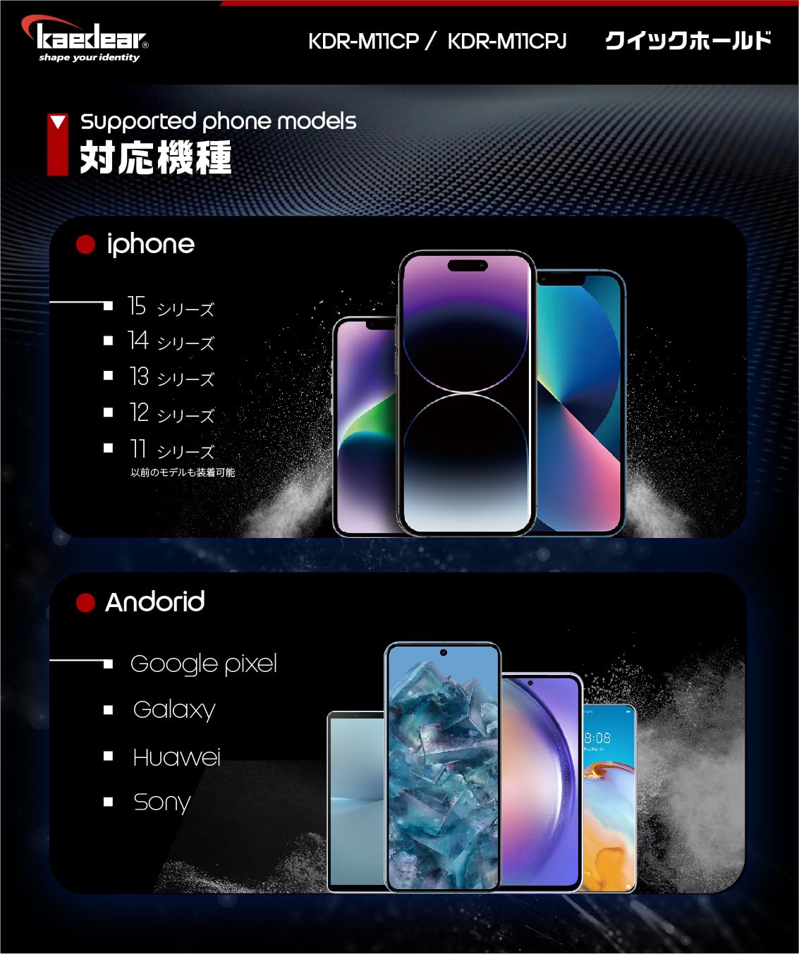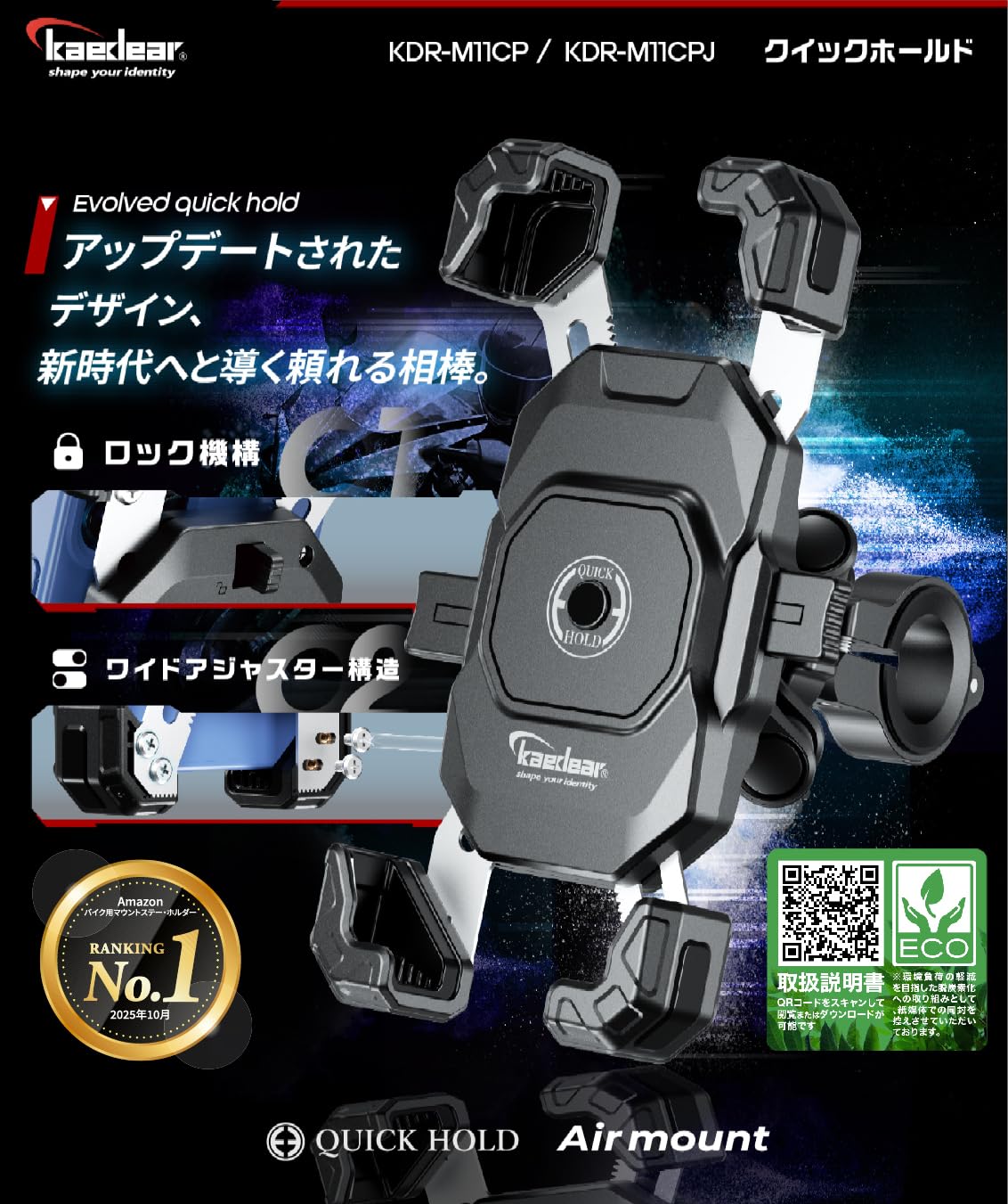 【元祖クイックホールドの後継モデル】 地球上で最も早く片手でスマートフォンの付け外しが可能なスマホホルダー。スマホを押し付けるだけで瞬時にホールドし、両脇のリリースレバーを握るだけで開放します。「Airアブソーバーの取り付けは難しそう」、「初代クイックホールドが好きだけどカメラの出っ張りのせいで使えない」 、「アームをロックして不測の事態に備えたい」そんな方にオススメなモデルの最新作クイックホールドⅡ(Airアブソーバー)/KDR-M11CPJです。