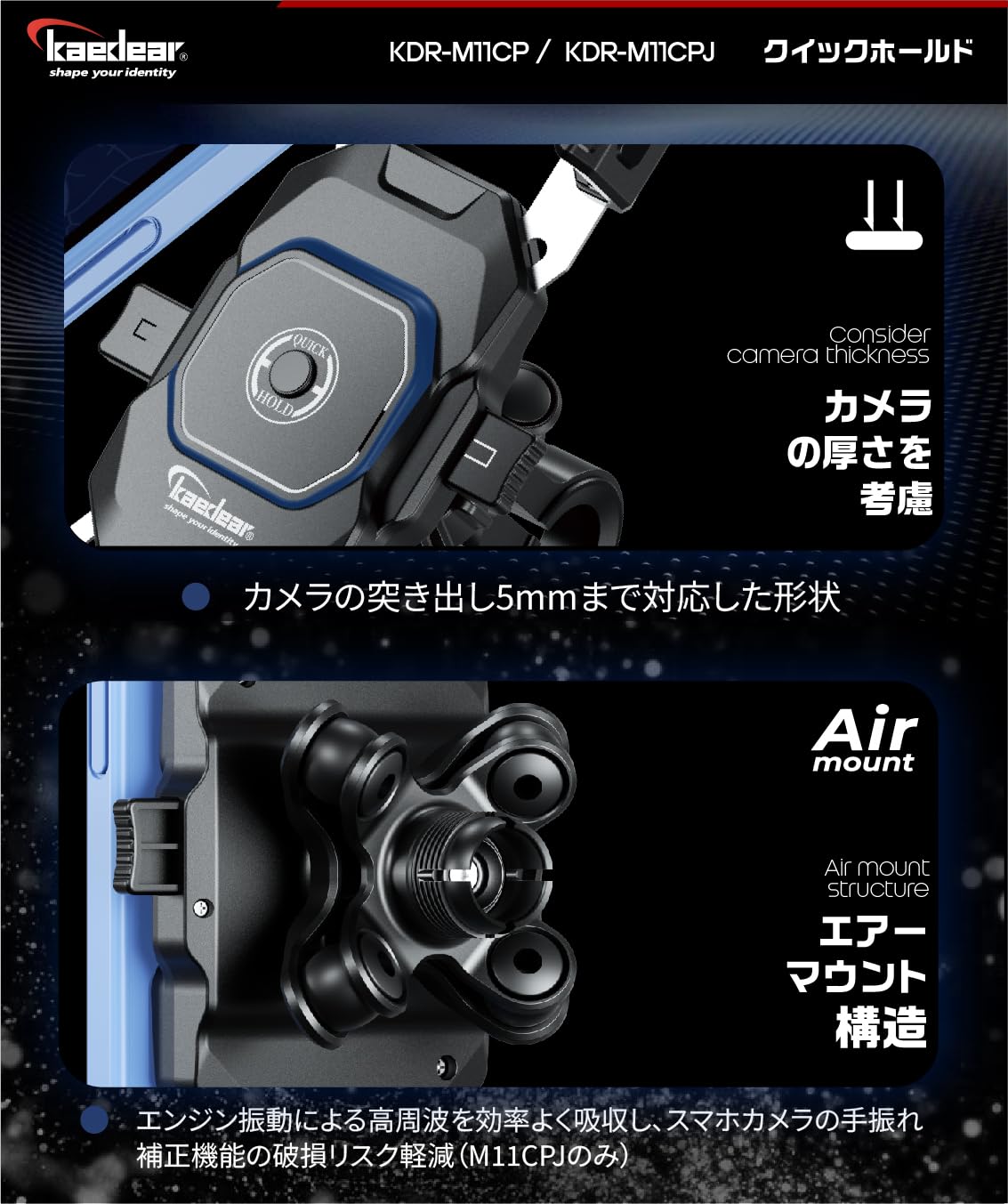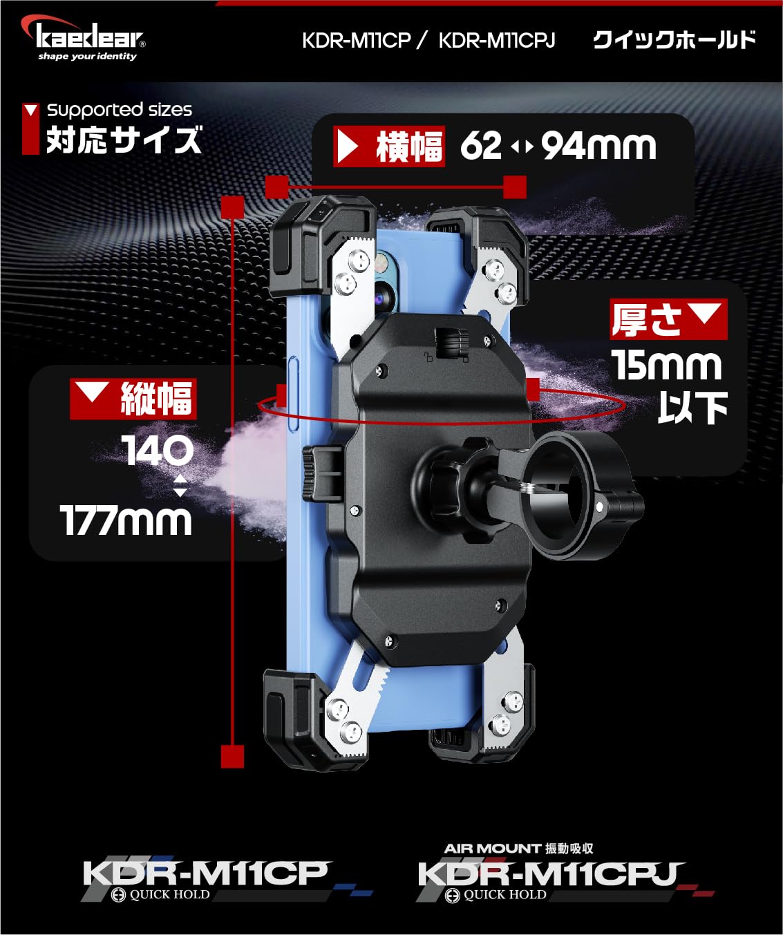 【在庫処分】Kaedear(カエディア) バイク スマホホルダー バイク用スマホホルダー 携帯ホルダー 振動吸収 マウント 付属 スマホ スタンド アルミ製 マウント ハンドル ミラー 原付 オートバイ 自転車 / スマホ厚さ15mmまで 縦長スマホ カメラ突き出し対応/アームロック機構 クイックホールドⅡ/Airアブソーバー KDR-M11CPJ-BK