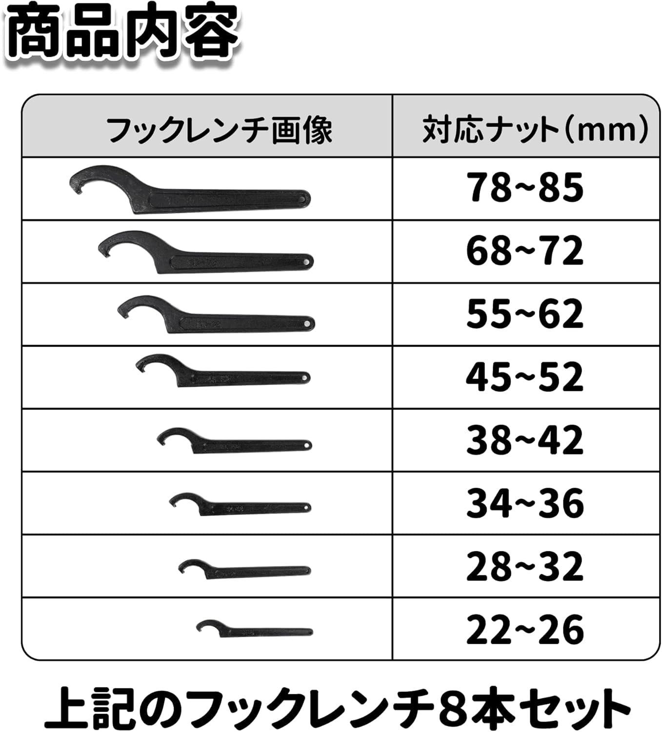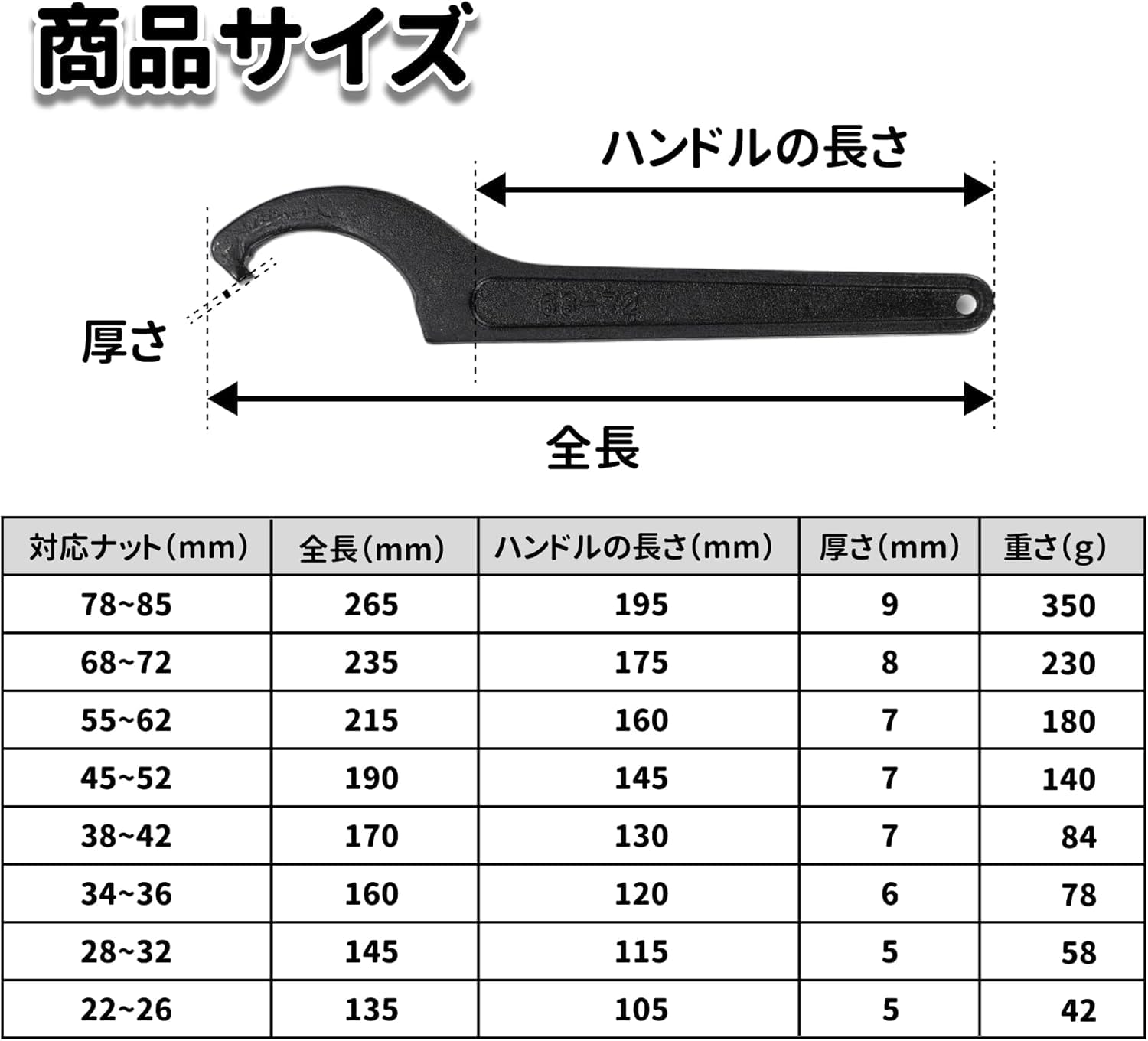 ??【5〜165kgまで調節可】一般男性からプロアスリートまでどなたでもトレーニングできます。5kgから165kgまで細かな強度調節が可能な強力アジャスタブルハンドグリップです。通常程度の握力の男性に力持ちの女性、強い握力の持ち主のアスリートまで、一台で握力トレーニングがこなせます。 ?【高品質な素材】握力 トレーニング ハンドルはPA+ばね鋼の素材を採用し、厚くて硬化された鋼鉄ブロック、航空鋼、摩耗や変形の心配なし、使い心地がよい、長時間に使用できます。 ??いくつもハンドグリップをお買い求めになる必要はありません。一台で体系的なトレーニングが可能です。 強度弱めでのウォーミングアップから、みずからの限界値に挑むネガティブトレーニングまで、一台のハンドグリップでこなせますから、システマティックな握力トレーニングが可能なのです。 ?【適用対象】手首や握力を鍛えることができます。アスリート、ミュージシャン、ピアニスト、登山家、ボディビルダーなど、指や手首、前腕の筋力アップが必要な方に最適です。 野球、テニス、バドミントン、バスケットボールなどのスポーツを楽しみ、腕力をつける必要がある方に。製品を受け取った後に品質問題や不満があれば、コメントを残す前に連絡してください。無条件に返品します。 ?【いつでもどこでも】ギシギシという耳障りな音がしません。持ち運びに便利ですのでいつどこででも持ち歩いてのトレーニングが可能です。自宅、オフィス、自動車の中、飛行機の機内、そればかりか静謐な図書館でもギシギシという耳障りな音がしませんので、どこであろうとお望みの場所で握力トレーニングをしていただけます。 【 商品内容 】 ・フックレンチ:2本セット ・対応ナットサイズ: 68-72mm(全長:235、230g)×2 ・素材:クロムバナジウム鋼/ 【 商品内容 】 ・フックレンチ:8本セット ・対応ナットサイズ: 22-26mm(全長:135、重さ:42g)×1 28-32mm(全長:145、58g)×1 34-36mm(全長:160、78g)×1 38-42mm(全長:170、84g)×1 45-52mm(全長:190、140g)×1 55-62mm(全長:215、180g)×1 68-72mm(全長:235、230g)×1 78-85mm(全長:265、350g)×1 ・素材:クロムバナジウム鋼