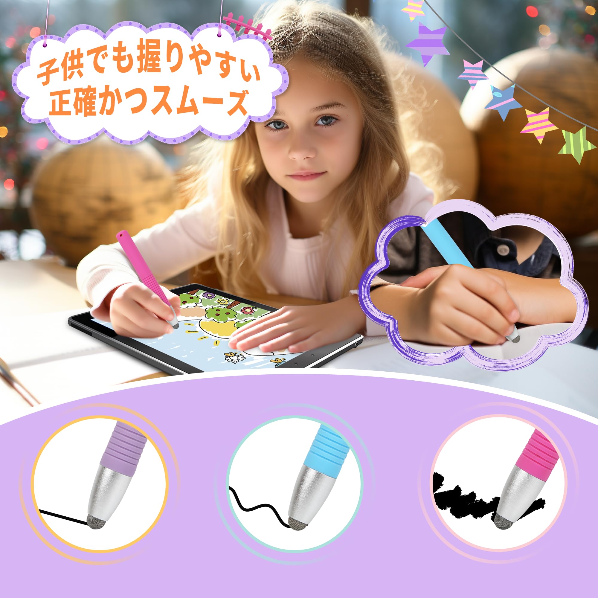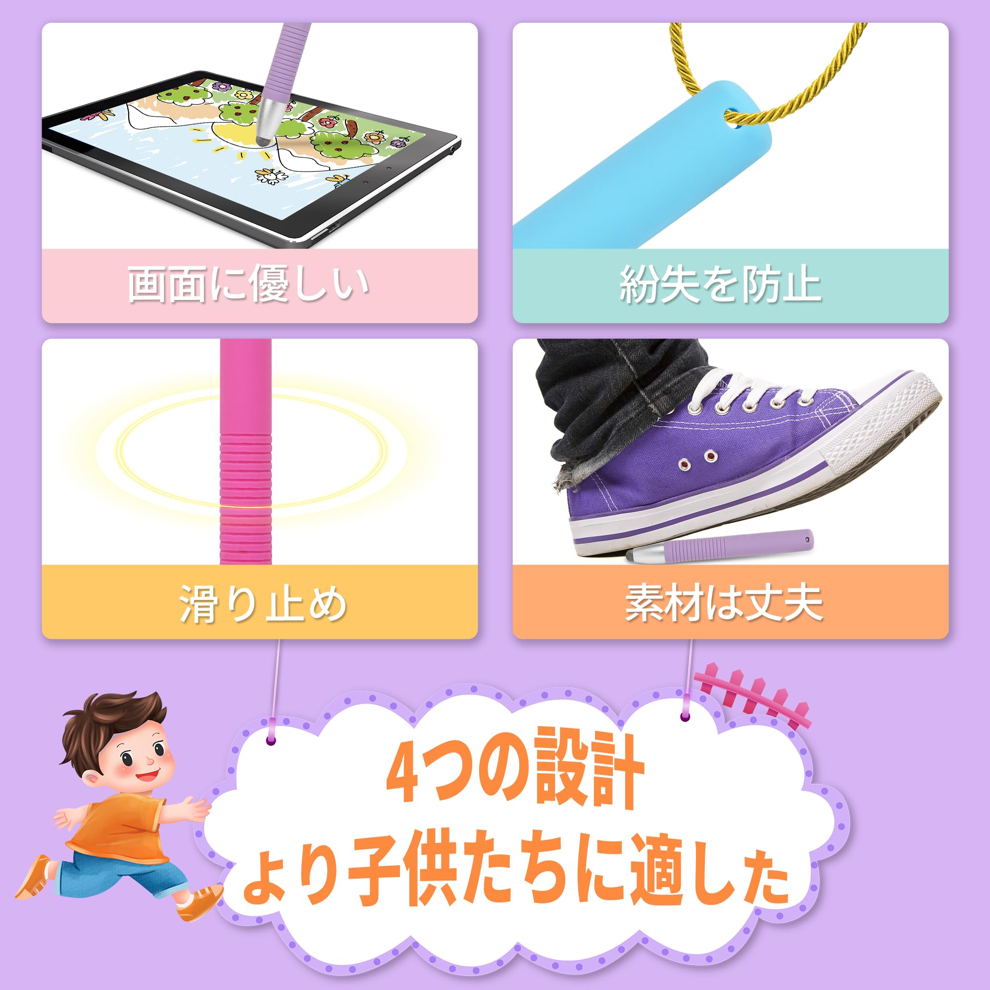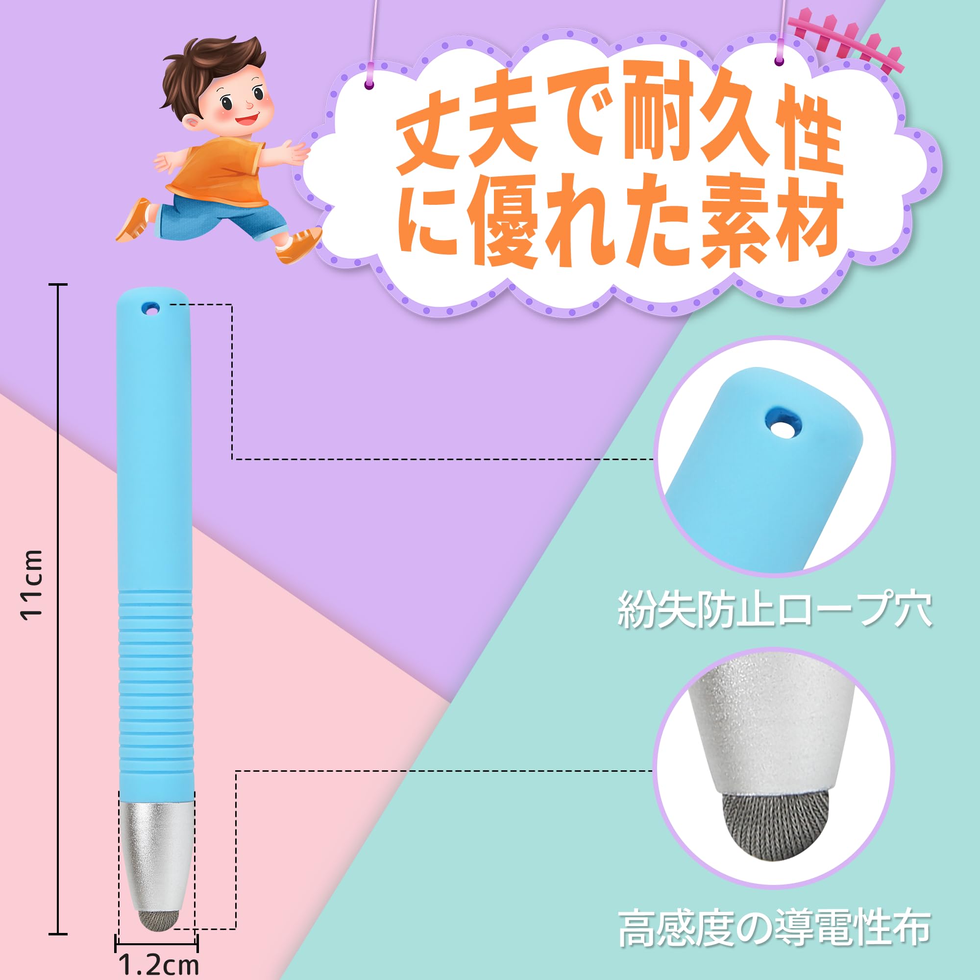 (商品デザイン)本商品はお子様が握りやすい適度な太さで設計されており、お子様の小さな手にもフィットとしてお使いいただけます。ペンヘッドは高品質の導電性布で作られており、タッチスクリーンへの反応が良く、画面を保護します。やわらかい素材で仕上げているため間違って踏んで足を傷付けたり、タブレット等の画面を傷付けません。 (プロの絵画アプリには適していません)