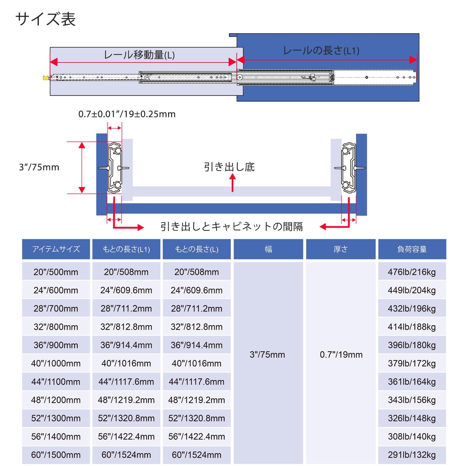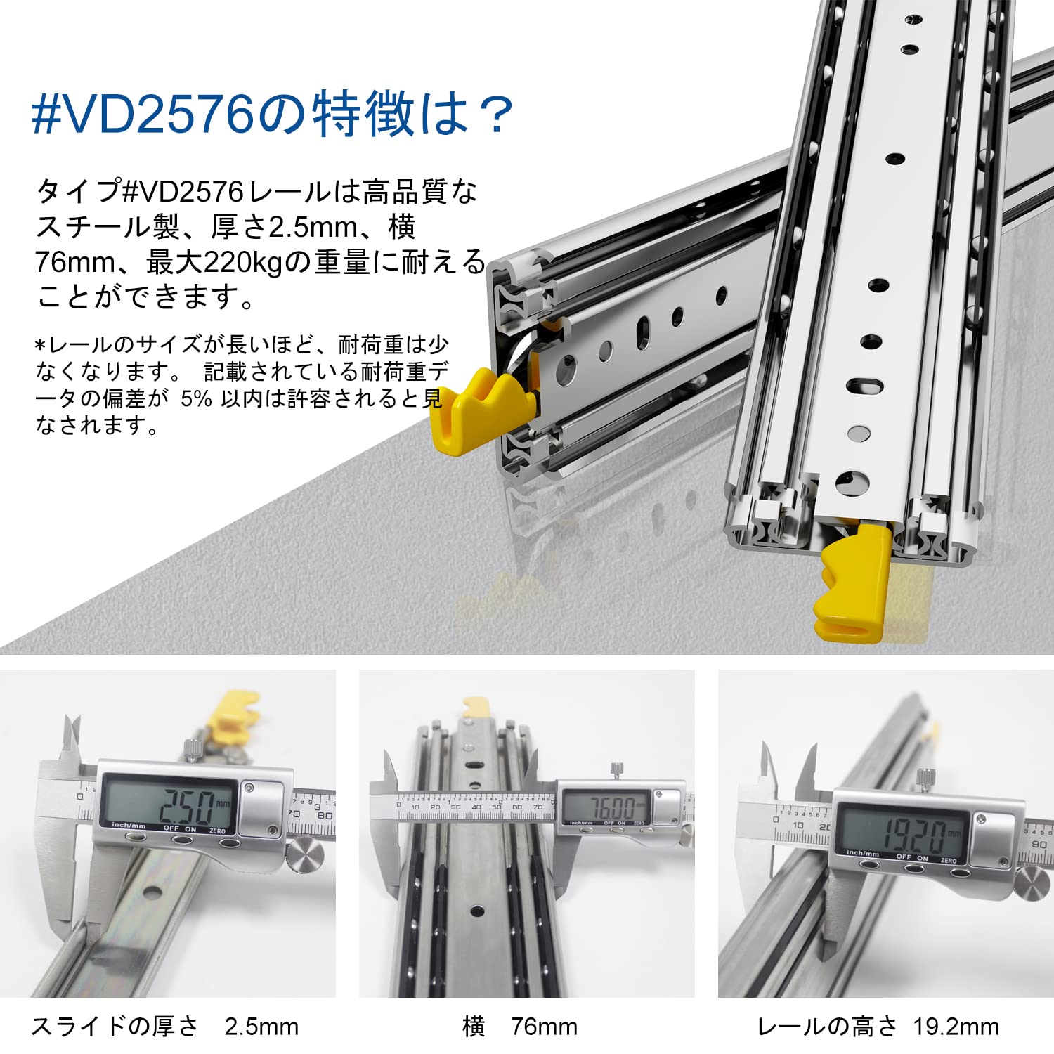 工業用超重量用スライドレール --- #VD2576 シリーズは幅が 76mmで、最高の耐荷重を備えています。長さは1500mmの場合は、最大耐荷重は130kg です。 スライドがレールは長くなると耐荷重が減ります。 記載されている耐荷重データの偏差が 5% 未満であれば、別の用途で許容されるとみなされます。